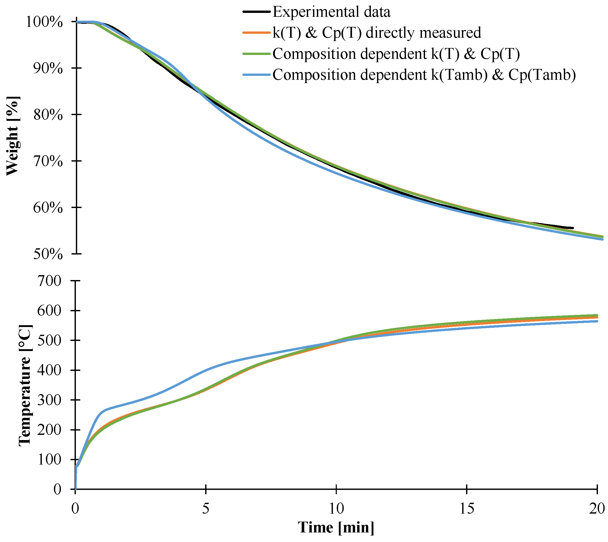 The last objective of this part is to validate the different methods developed in this paper to generate inputs data for the pyrolysis model. Thus, the model was then used considering direct measurement, or thermal conductivity and heat capacity dependent on the composition and temperature, or with values determined at ambient temperature. Figure 19 shows the results obtained considering these approaches. The predicted weight loss assuming slow diffusion and thermal parameters as a function of composition and temperature or just as a function of temperature leads to similar results and is in good agreement with the experimental data. This can be linked with the relative good agreement of the averaged thermal conductivity inside the plaque for both temperature-dependent approaches, as shown in Figure 20. On the contrary, taking into account the composition-dependent thermal parameters at ambient temperature leads to some difference in the weight and temperature profiles. Indeed, the weight after 5 min is slightly under-predicted compared to experimental values even if the temperature is up to 60 °C higher. The temperature at the backside of the plaque is higher due to a higher conductivity inside the plaque during the first 5 min compared to temperature-dependent thermal parameters.