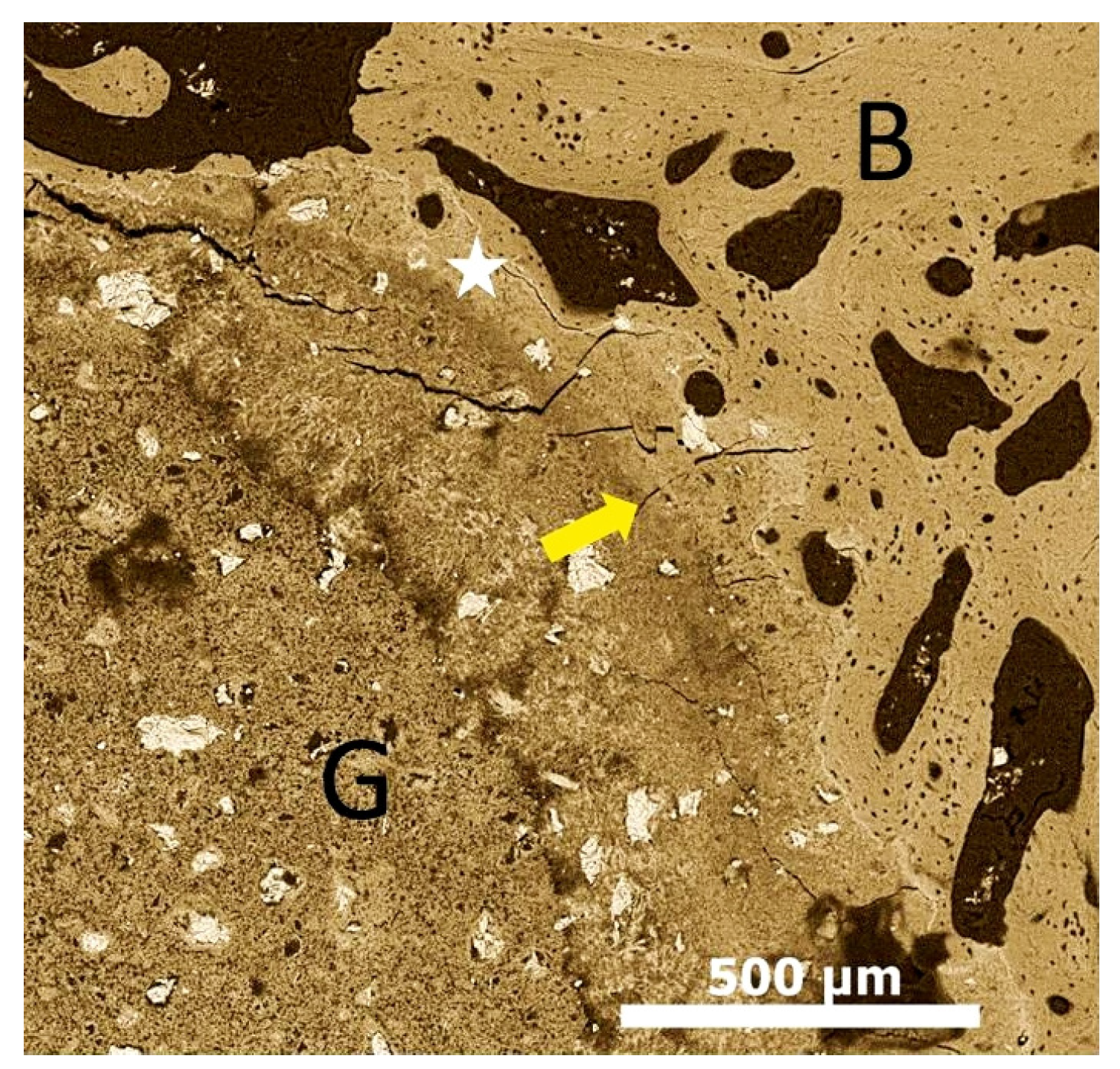 Scanning electron microscope image showing calcium phosphate graft material after 12 weeks osteointegrated with bone and the osteoconduction of bone tissue around the graft material. Graft-Bone interface (Yellow arrow); existing bone (B); graft material (G); Creeping bone substitution/osteoconduction (White star).