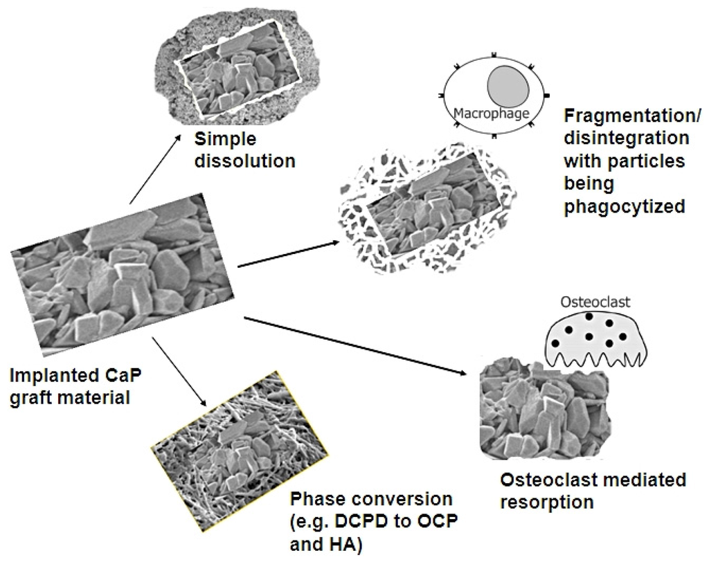 For clarity, the term “degradation” represents the physical process of disintegration and fragmentation, whereas, the term “resorption” essentially signifies biodegradation taking place via cellular mechanisms. Biodegradation of CaP based biomaterial is thought to take place via solution-driven extracellular liquid dissolution and cell-mediated resorption processes [28]. The fate of implanted CaP biomaterials is dependent on various mechanisms and processes (Figure 2).