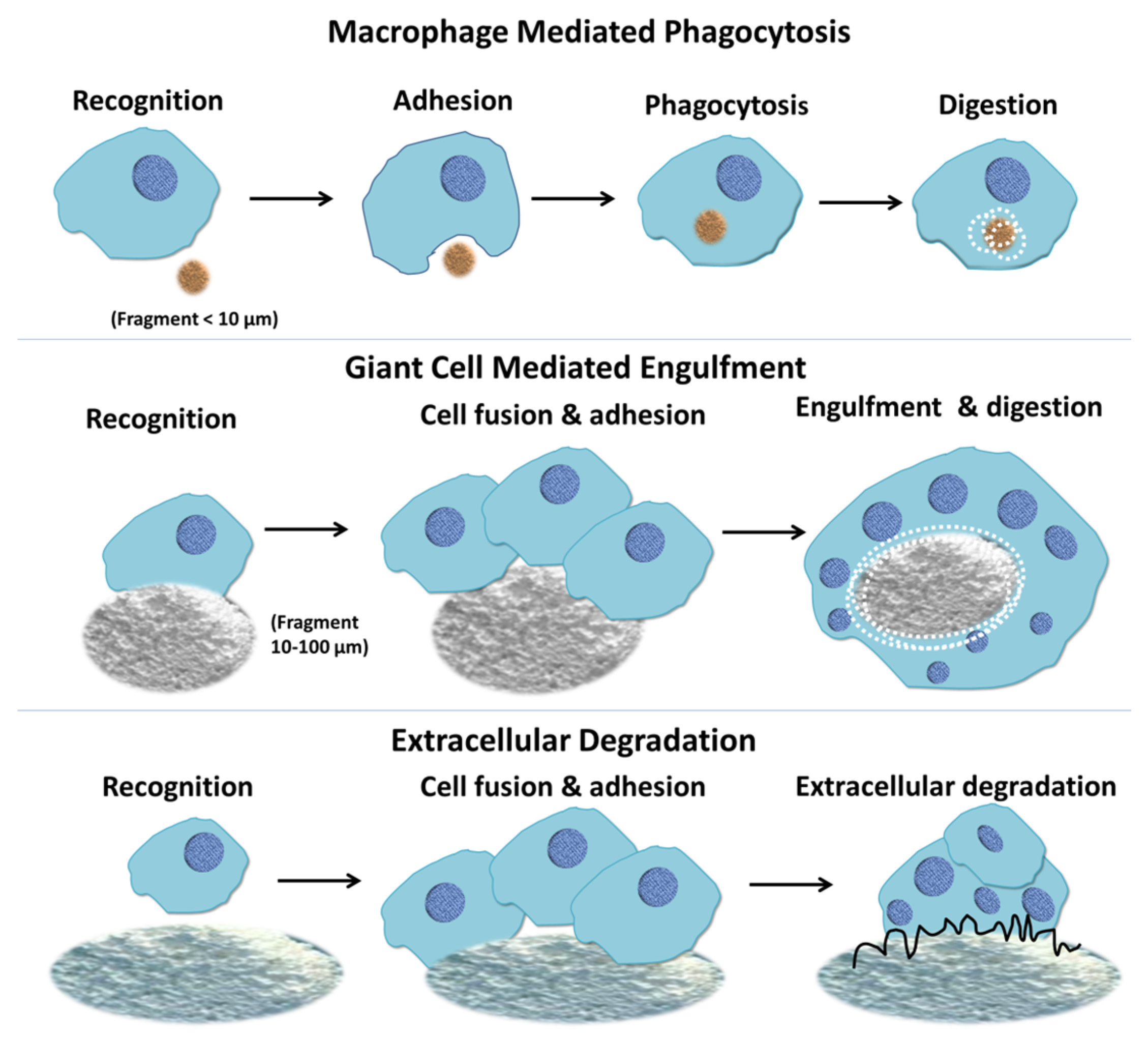 Biomaterial particles that are generated interact with immune cells (e.g., polymorphonuclear neutrophils and monocytes), leading to cell activation and the release of inflammatory mediators [30,31]. The macrophages or giant cells encounter the CaP particles, attach, and get activated to endocytose [28]. The particle size of the CaP materials implanted affect the rate and effectiveness of cellular resorption activity [32]. The cells that take part in cell-mediated CaP resorption may be osteoclasts, multinucleated giant cells, monocytes, and macrophages directly available in the bone marrow tissue. Phagocytic mechanisms regulated by the monocytes/macrophages or acidic mechanisms via osteoclasts (by reduction of pH in the microenvironment) result in bioresorption of CaP cements in vivo [33]. Macrophages respond to small fragments and particles (<10 μm in diameter) by internalization via phagocytosis and intracellular digestion (Figure 3). If the particle size is larger than 10 μm and smaller than 100 μm, the macrophages fuse together forming giant cells which in turn engulf the particles and digest them (Figure 3) [34]. If the particles are larger, the bulk digestion is carried out via extracellular degradation by macrophages and macrophage-fused giant cells through release of enzymes and/or pH lowering mechanisms (Figure 3) [34,35].