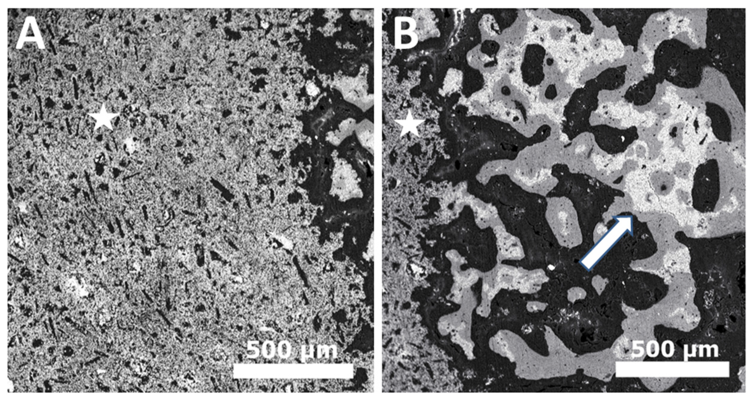 Back scatter scanning electron microscope image of (A) Dicalcium phosphate anhydrous (DCPA/monetite) after two weeks of implantation; (B) Dicalcium phosphate anhydrous (DCPA/monetite) after eight weeks of implantation showing resorption and replacement of graft material with new bone tissue. [White star indicates DCPA graft material & White arrow indicates remaining graft material (white) being surrounded by new bone (grey)].