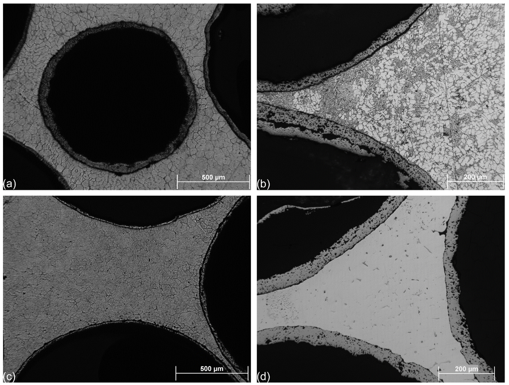 Micrograph of a typical GM grade iron hollow sphere in (a) Al99.5-O; (b) AlSi12-O; (c) AlMgSi1-O; and (d) AlCu5-O AMSF.
