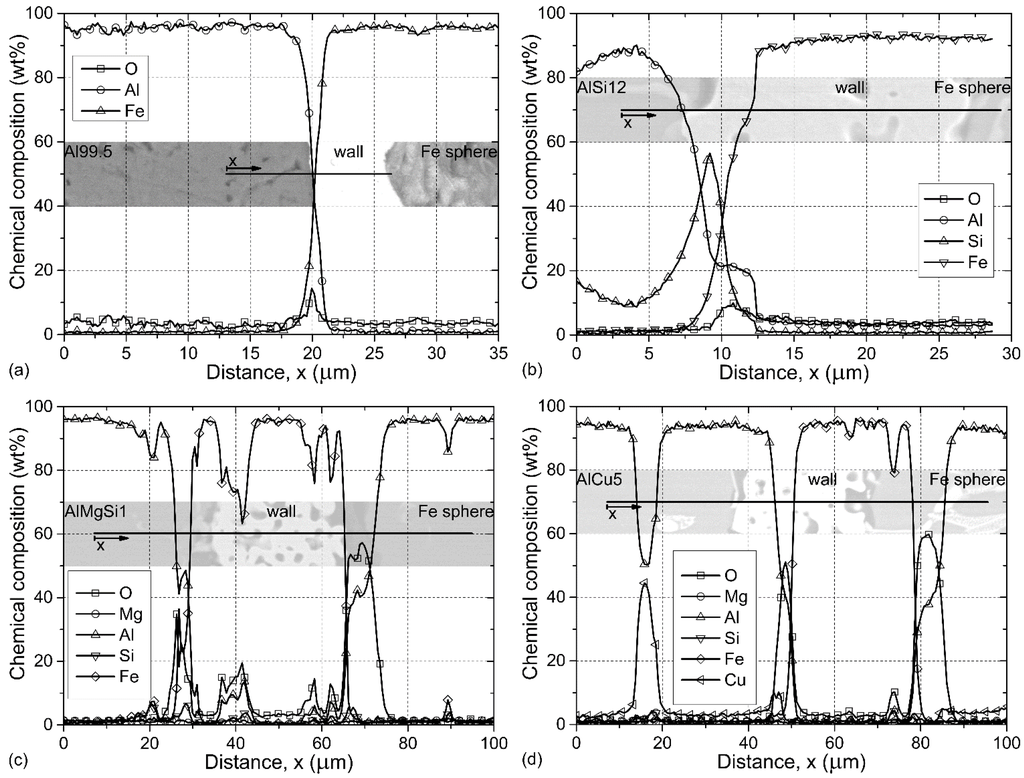 In the simplest case (Al99.5-O AMSFs), an approximately 5-μm thick interface layer can be observed between the hollow sphere and the matrix material (Figure 2a). At the middle of the interface layer, an O peak can be observed because the Fe hollow spheres were exposed a slight oxidation during the preheating process of the production (see Section 3.1). There were no needle-like precipitations (common for Al-Fe intermetallics) observed in the vicinity of the outer surface. In the case of AlSi12-O foams (Figure 2b), the thickness of the interface layer was ~10 μm. Near to the outer edge (left side) of the wall a primer Si precipitation (Si peak in the graph) can be observed. The Fe content increased rapidly from ~7.5 μm, indicating the outer edge of the wall. In the next ~10 μm, the Al and O content also increased indicating the reaction between the oxide layer on the outer surface of the spheres and liquid aluminum, presumably resulting in a thin Al2O3 layer. Figure 2c shows a more complex situation in which the iron hollow sphere was originally broken and the liquid aluminum could fulfill the sphere during the production (infiltration). Higher O content was measured at both the outer and inner surfaces of the sphere due to the oxidization during the pre-heating. The thickness of the interface layers measured ~10 μm. Again, the O had peaks at both surfaces along with the stabilization of Al content confirming the afore-mentioned reaction between Al and O. The sudden changes in the Fe content and parallel in the Al and O content highlight the porous nature of the iron spheres’ wall; these porosities were also penetrated by Al in the case of this distinguished broken sphere. A similar, infiltrated sphere from the AlCu5-O foam is shown in Figure 2d. Besides the oxide layer on the wall surfaces and the corresponding changes in the Al content, a CuAl2 precipitation was crossed just before the outer surface of the sphere. Additionally, some Cu was also detected in the ~10 μm thick interface layers along with the Al and O content, indicating that, during cooling, the Cu rich particles tend to solidify on the surface of the spheres.