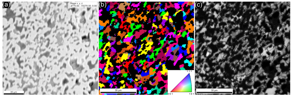 (a) SEM image; (b) EBSD image; and (c) image quality map of the iron sphere wall (cross-section).