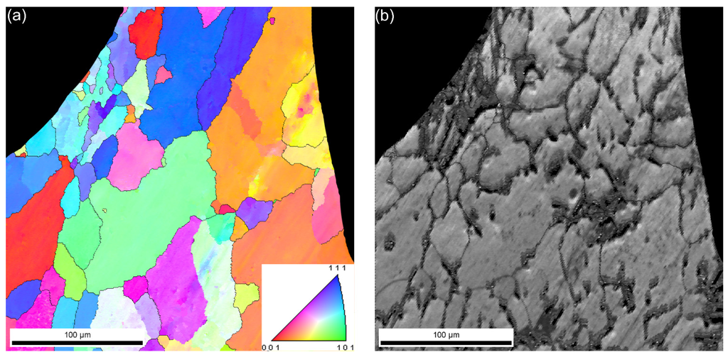 (a) EBSD image and (b) image quality map of Al99.5-O AMSF.