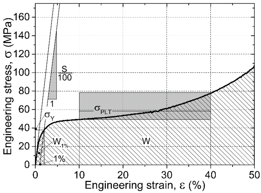 During the compression tests, the engineering stress–engineering strain curves from the measurements were registered. A typical curve is shown in Figure 5. The recorded graphs follow the typical form of metallic foams, with a short linearly elastic section, a plateau region and subsequent densification. There are some characteristic properties that can be obtained from the curves according to the ruling standard [33]. The most important characteristic property in the design point of view is the yield strength ( (MPa)) that was determined at 1% plastic deformation. At this strain and corresponding stress level, macroscopic cracks could be observed on the surface of the specimens; the cracks usually initiated in the vicinity of the hollow spheres. The next important strength value is the plateau strength (MPa)), that was determined as the average stress level between 10% and 40% strains (the limits were selected according to the recommendations of the standard [33]). The investigated AMSFs showed continuously increasing plateau region representing deformation hardening nature. Besides the strength values the structural stiffness (MPa)) of the material (recognized as the slope of the initial part of the graph) is also an important (elastic) property. Finally, the energy values absorbed up to the appearance of the first crack and up to the end of the compression are also important characteristic properties, respectively. The energy level required to initialize the fracture process can be calculated as the integral of the curve up to 1% overall deformation (the area under the curve up to 1%, (MJ·m−3)). The overall absorbed mechanical energy (MJ·m−3) can be determined as the area under the whole curve. The aforementioned mechanical properties are the characteristic properties of the AMSFs and they were monitored in the case of all produced material types. Figure 5 shows the graphical presentation of the characteristic properties.