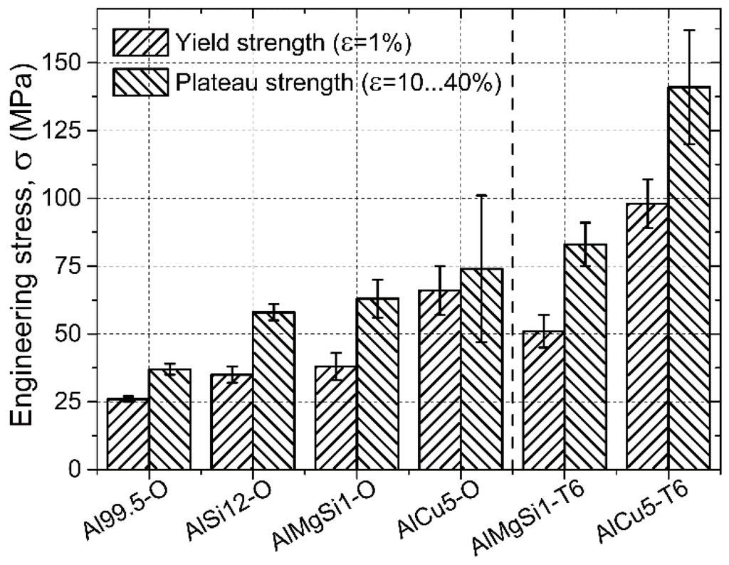 Regarding the strength values (Figure 6), the Al99.5-O AMSFs showed the lowest yield and plateau strengths. Both characteristic strengths increased significantly due to the alloying (solution hardening), however the alloying elements had quite different efficiency: Cu was found to be the most effective and resulted in ~+40 MPa (~150%) and ~+35 MPa (~100%) higher yield and plateau strength compared to Al99.5-O specimens, respectively. Note that the higher strength AlCu5-O AMSFs had significantly wider standard deviation because of the more stochastic fracture behavior of the higher strength matrix material. The T6 heat-treated specimens showed even higher yield strength values, generally ~30% higher than the specimens with solution heat treatment. Compared to the Al99.5-O samples ( = 26 ± 1 MPa) about four times higher yield strength can be achieved by T6 treated AlCu5 matrix ( = 98 ± 9 MPa). Moreover, the aged specimens also had higher plateau strength values than that of the solution heat-treated ones, as it was expected. The plateau strength is also important in the energy absorption point of view. The stress level of this region has distinguished role. For example, in the case of collision dampers, longer plateaus characterized by lower stress levels are more beneficial than the shorter plateaus with higher stress levels, because the reaction forces and the effects on the personnel may be lower.