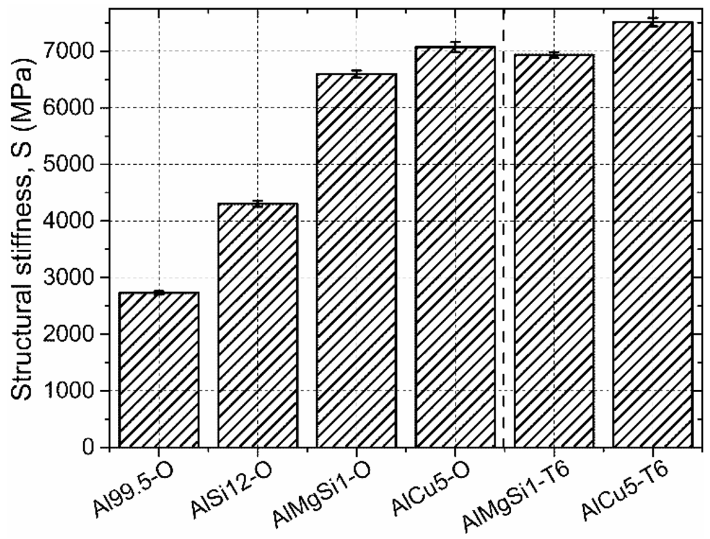 Considering the structural stiffness values (Figure 7), again, the unalloyed matrix AMSF showed the lowest value. Both the low amount Mg-Si and Cu alloying exhibited significant improvement, similarly to the quite large amount of Si alloying in the case of AlSi12-O specimens. The latter, nearly eutectic matrix had about twice as high stiffness, than the unalloyed Al99.5 samples, due to the high Young modulus of the Si precipitations (130–169 MPa, depending on the crystal orientation). In T6 treated conditions, the hardening mechanism increased the structural stiffness as well, the increment was minimal, ~5%–10% as it was experienced in the case of strength values too.
