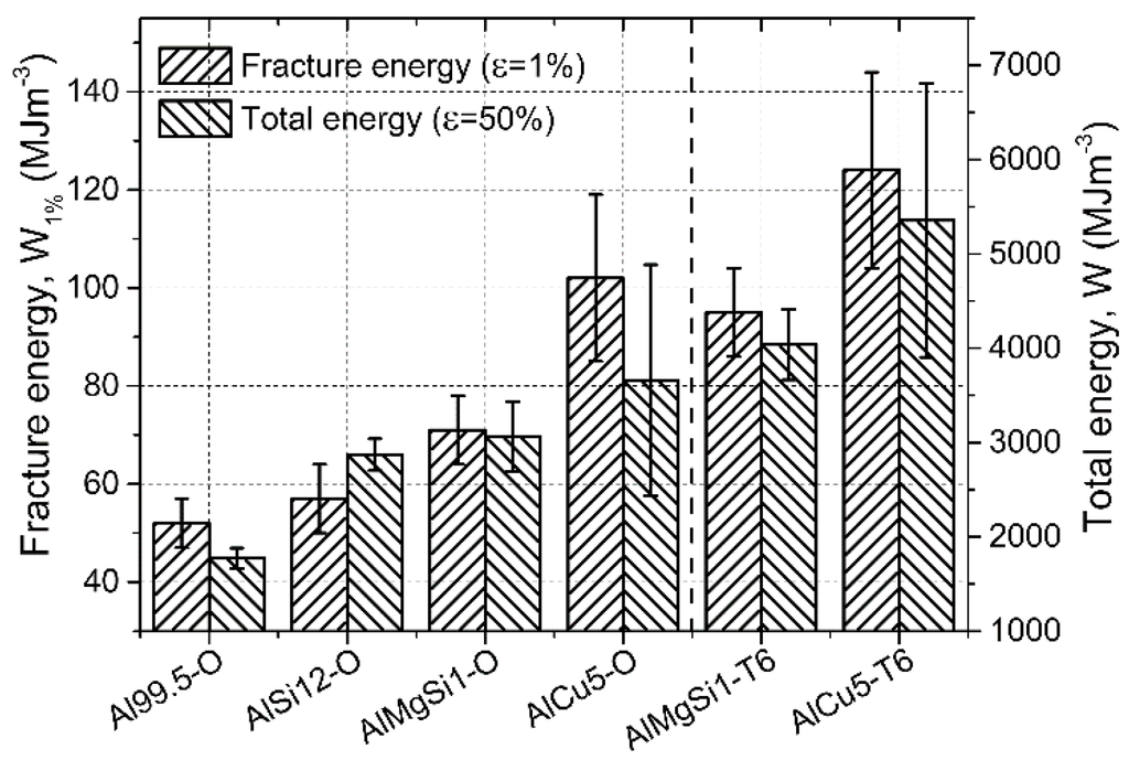 The fracture energies followed the trends of the yield strength (Figure 8), because the limits of the integration aiming to calculate the fracture energies were the same. The highest fracture energy therefore was shown by the AlCu5-O foams. The same trends were observed in the case of the total absorbed energies: the stochastic nature and higher scatter [34] of the plateau and densification region was more pronounced, as it can be also deduced from the higher scatter bands plotted around the discrete values in Figure 8. The T6 heat treatment ensured higher absorbed energies in the case of AlMgSi1-O and AlCu5-O AMSFs, respectively. The increment in the absorbed energies was ~30% in both cases of fracture and total energies.
