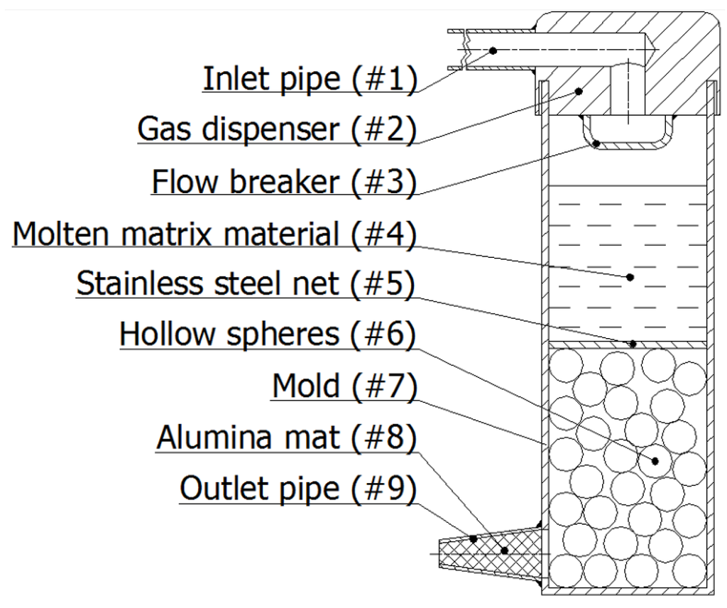 For the infiltration process, a special mold was prepared (Figure 9). The mold (#7) was coated by a FormKote T-50 graphite layer (Everlube Products, Peachtree City, GA) in order to facilitate the composite removal. The mold was filled halfway by the hollow spheres (#6) during continuous tapping (to achieve ~65% volume fraction [36,37]). The filler was fixed in position by a 316L stainless steel net (#5) and pre-heated in a furnace (Lindberg/Blue M) to 300 °C for 0.5 h. Meanwhile, the matrix material was melted and overheated (Tmelting + 50 °C) in a Power-Trak 15–96 induction furnace. The molten matrix material (#4) was poured into the mold and the inert gas (Ar) was injected into the system through a pressure reducer and the pipe system (#1 and #2) to ensure the 400 kPa infiltration pressure. The gas from the spaces between the hollow spheres was exhausted through an Al2O3 mat (#9) stuffed pipe (#8) at the bottom of the mold. After rapid solidification, the mold was opened by milling and the AMSF block was removed. For further details, please refer to [34].