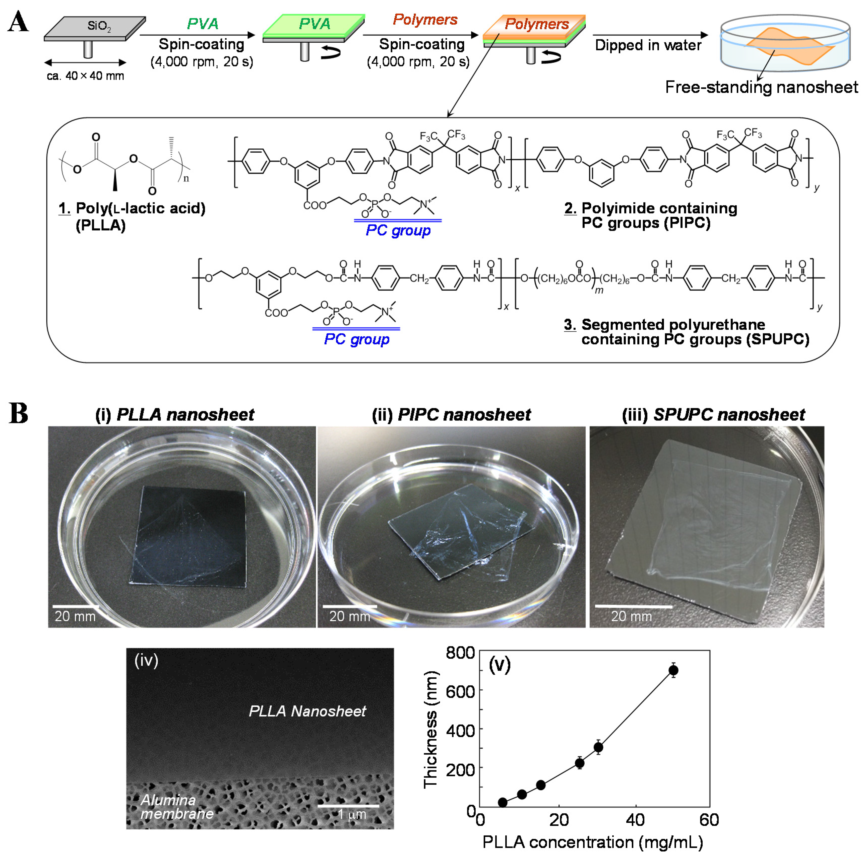 Free-standing centimeter-sized nanosheets composed of bio-friendly polymers. (A) Fabrication scheme for the nanosheet using a water-soluble sacrificial layer, and chemical structures of the bio-friendly polymers utilized in this review (obtained from [16] and partially modified, with permission from Trans. Mat. Res. Soc. Japan.); (B) Macroscopic images of the free-standing nanosheets of (i) PLLA; (ii) PIPC; and (iii) SPUPC exfoliated in water (originally photographed according to [13,15,16,17]); (iv) SEM image of the surface of the PLLA nanosheet adhered to an alumina membrane (originally photographed according to [13]); (v) Relationship of thickness of the PLLA nanosheet and PLLA concentration in a spin-coating process (obtained from [13] and partially modified, with permission from John Wiley & Sons.).