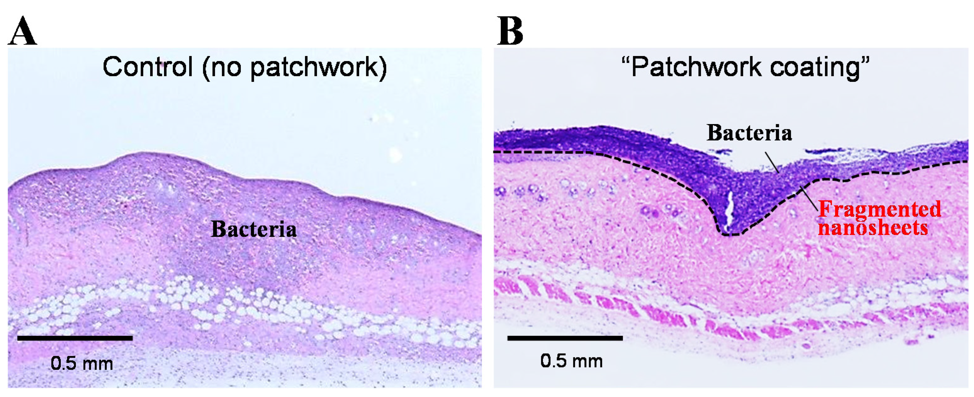 Prevention of infection using a patchwork coating of fragmented PLLA nanosheets in a burn wound model in mice. (A) Histological image of skin in control experiments without patchwork coating. The bacteria (Pseudomonas aeruginosa) penetrated into the dermis and subcutaneous layer, resulting in infection; (B) Histological image of skin treated with patchwork-like coating. The bacteria remained on the surface of the skin (dotted line), showing the prevention of infection (obtained from [16], and partially modified, with permission from Trans. Mat. Res. Soc. Japan.).