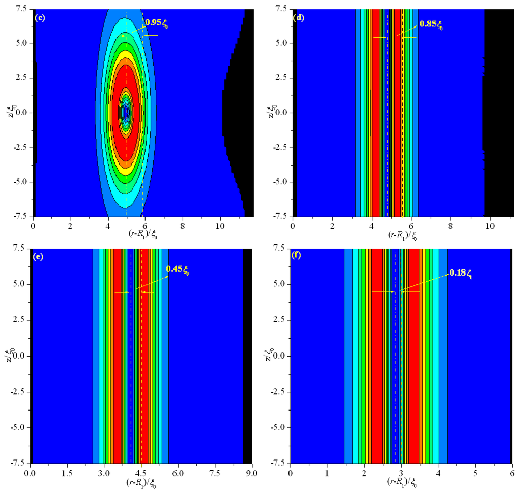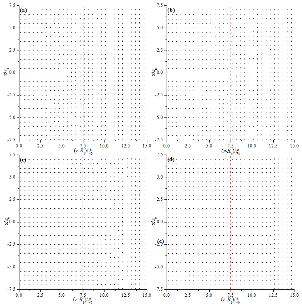 Figure 2 and Figure 3 show that the defect center is not located in the middle of the system but shifts to the internal surface; this phenomenon differs from the case of a planar cell [24,25]. Non-planar cylindrical geometry causes disclination loops to shrink, and the loop will not disappear under internal surface confinement [27]. Figure 3 shows that the deviations Δ(d) for different thicknesses (d) are 1.6 ξ0 (d = 15 ξ0), 1.3 ξ0 (d = 13 ξ0), 0.95 ξ0 (d = 11.8 ξ0), 0.85 ξ0 (d = 11.2 ξ0), 0.45 ξ0 (d = 9 ξ0), and 0.18 ξ0 (d = 6 ξ0). These finding indicate that Δ(d) decreases with decreasing d, even after eigenvalue exchange (Figure 3e,f). This behavior is due to the gradual transformation of the system to a planar structure with decreasing d.