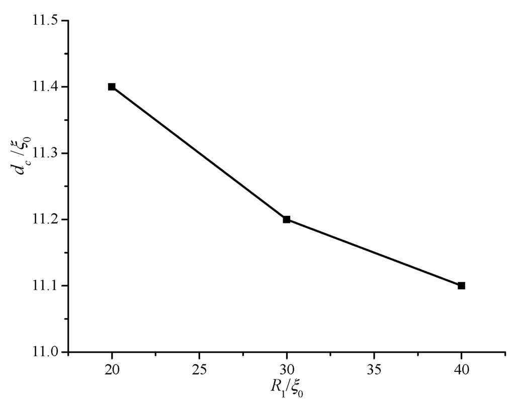The conditions of R1 = 20 ξ0 and R1 = 40 ξ0 are also investigated to explore the influence of internal radius R1 on equilibrium texture and transition. The critical dc values for different R1 values are shown in Figure 5. The value of dc increases with decreasing R1. This behavior indicates that the smaller the internal radius R1, the earlier the biaxial transition occurs. Therefore, a non-planar cylindrical system induces easy biaxial transition. The cylindrical system gradually flattens with increasing R1. Thus, we predict that dc gradually becomes equal to that of a planar cell with increasing R1.