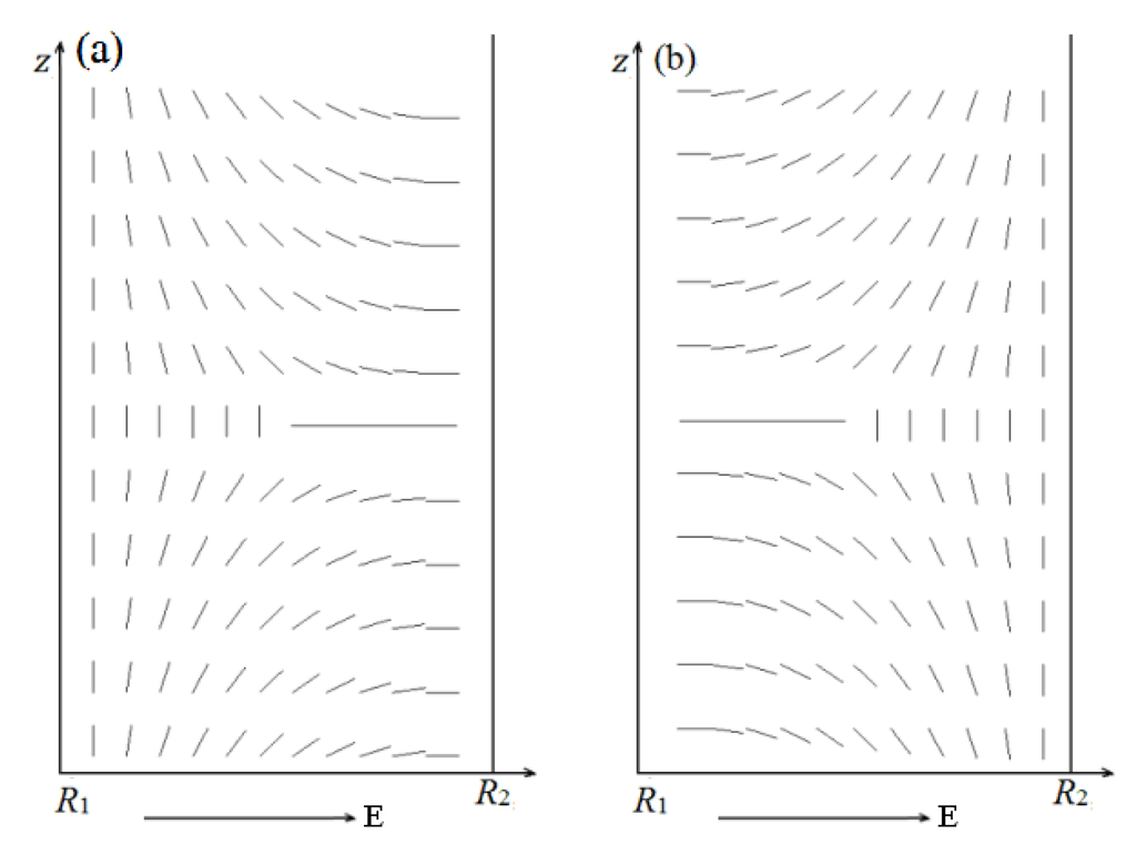 Let us consider an NLC confined between two coaxial cylindrical surfaces whose internal and external radii are R1 and R2, and the thickness of the shell is d = R2 − R1 (Figure 1a). The standard polar cylindrical coordinates and the corresponding local frame are introduced, where points along the symmetry axis, is the radial unit vector emanating from the symmetry axis, and . The electric field is applied along the axis direction, i.e., , which promotes the alignment of the nematic director along the axis.