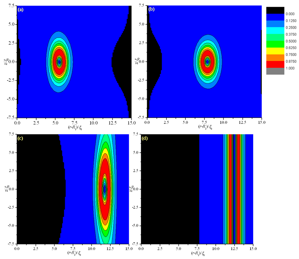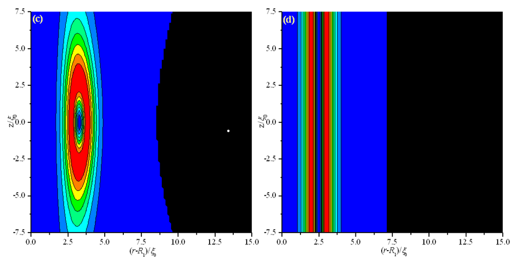 In this section, two models are established to analyze the combined effect of geometry and electric field . Boundaries on both coaxial cylindrical surfaces are exchanged for the two models, as shown in Figure 7. Simulations are conducted at internal radius R1 = 30 ξ0 and thickness d = 15 ξ0.
