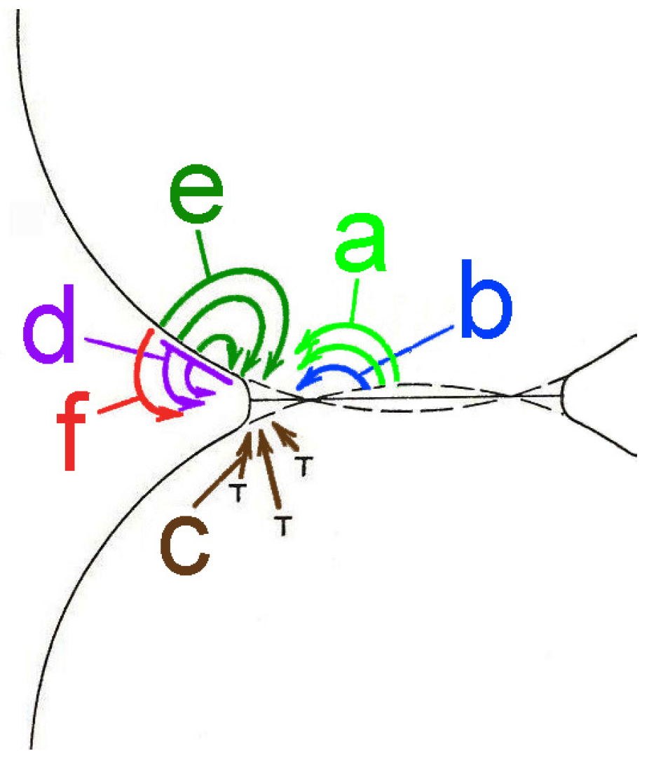 Material-transport mechanisms during solid-state sintering: lattice diffusion from the grain boundary (a) and from the surface (e) to the neck; grain-boundary diffusion (b); viscous flow (c); surface diffusion (d); and evaporation/condensation (f). The symbol “┬” marks the dislocations and other defects. (Reprinted with permission from [42]. Copyright 1976 Wiley-VCH.)