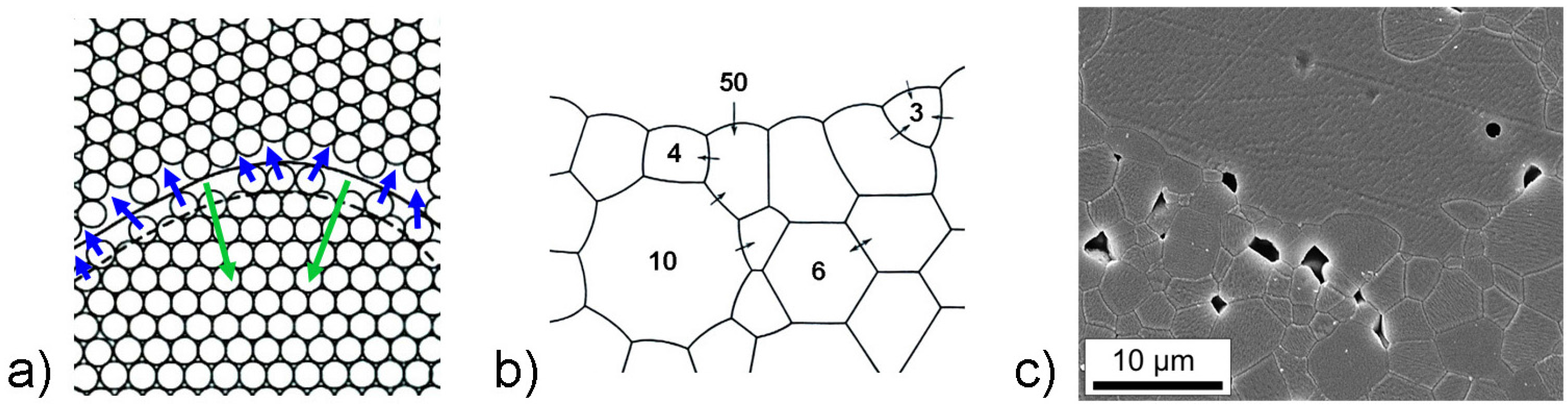 (a) Movement of the grain boundary towards its center of curvature (green arrows) by the diffusion of atoms across the boundary (blue arrows) (Reprinted with permission from [40]. Copyright 2003 CRC PRESS LLC). (b) Movements of grain boundaries (black arrows) depending on the number of sides in a polycrystalline ceramic (Reprinted with permission from [44]. Copyright 1990 Springer). (c) Grains with different sides and curvatures in NaNbO3, sintered for 15 min at 1350 °C (SEM image) (Reprinted with permission from [45]. Copyright 2011 The American Ceramic Society).