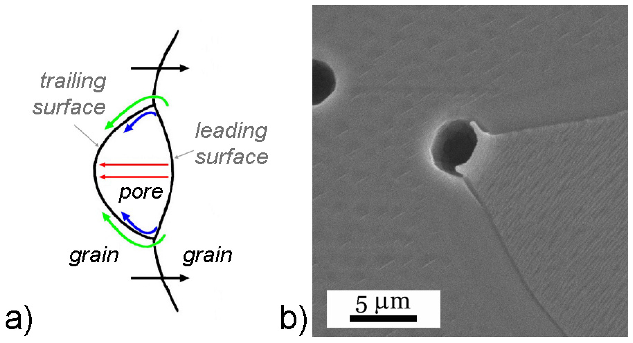 The grain-boundary mobility is additionally affected by various factors, the most important of them being the pores. A grain boundary moving under the influence of its curvature applies a force on a pore situated at the boundary, resulting in a change of the pore shape (Figure 3) [50]. The chemical potential difference driving the atom flux is created by the different curvatures of the leading and trailing surfaces of the pore. The material transport can occur via surface diffusion, lattice diffusion or evaporation/condensation. The grain-boundary migration is determined by the balance between the number of pores, their mobility, and the intrinsic grain-boundary mobility [51,52]. When the grain-boundary-migration velocity exceeds the pore-migration velocity, pore/boundary separation occurs (Figure 3b). The entrapped pores are difficult to eliminate due to the long diffusion distances; therefore, these conditions typically represent the limit of densification during sintering [52].