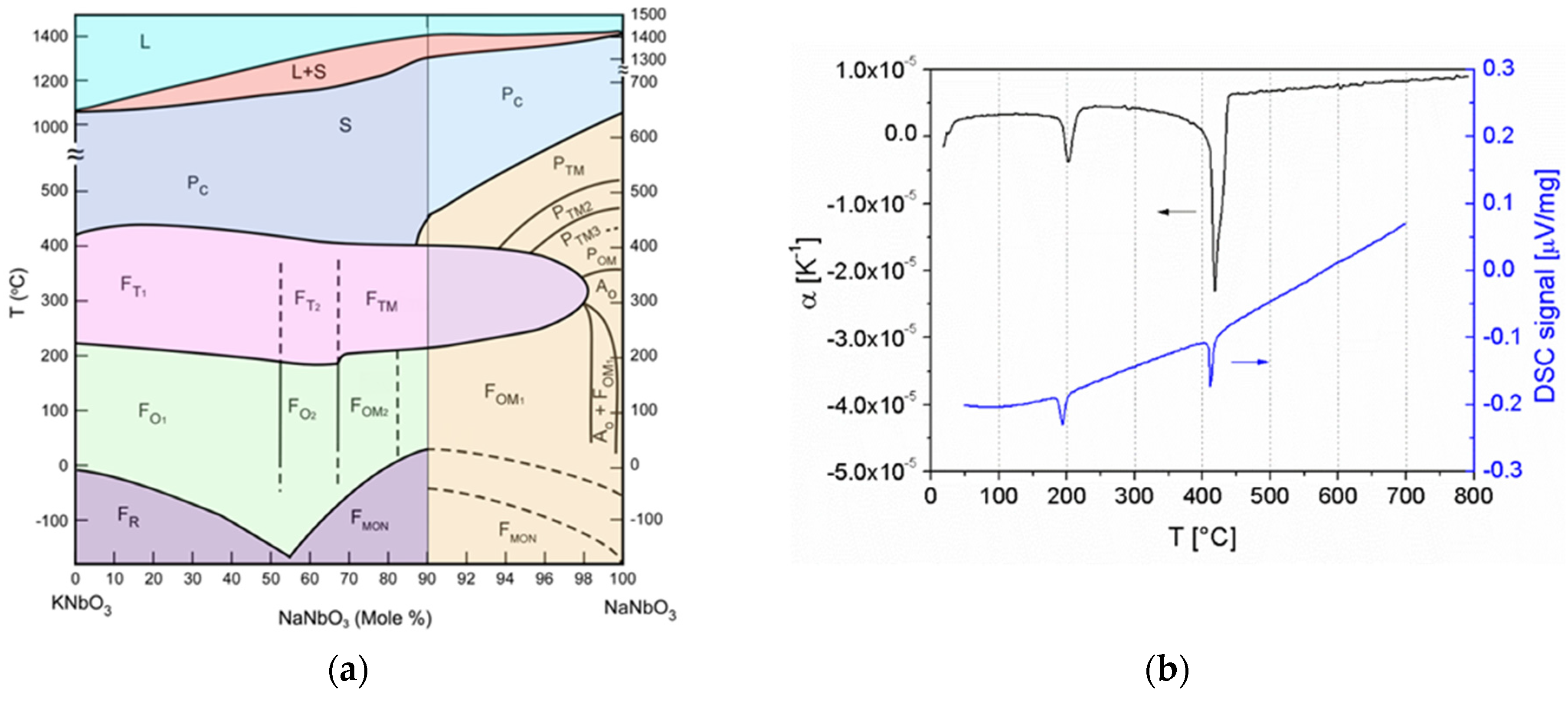 (a) Phase diagram of the KNbO3-NaNbO3 system (Reprinted with permission from [59]. Copyright 2006 The American Ceramic Society). (b) Phase transitions of the K0.5Na0.5NbO3 solid solution, as determined by dilatometry and differential scanning calorimetry upon heating (Reprinted with permission from [57]. Copyright 2011 The American Ceramic Society).