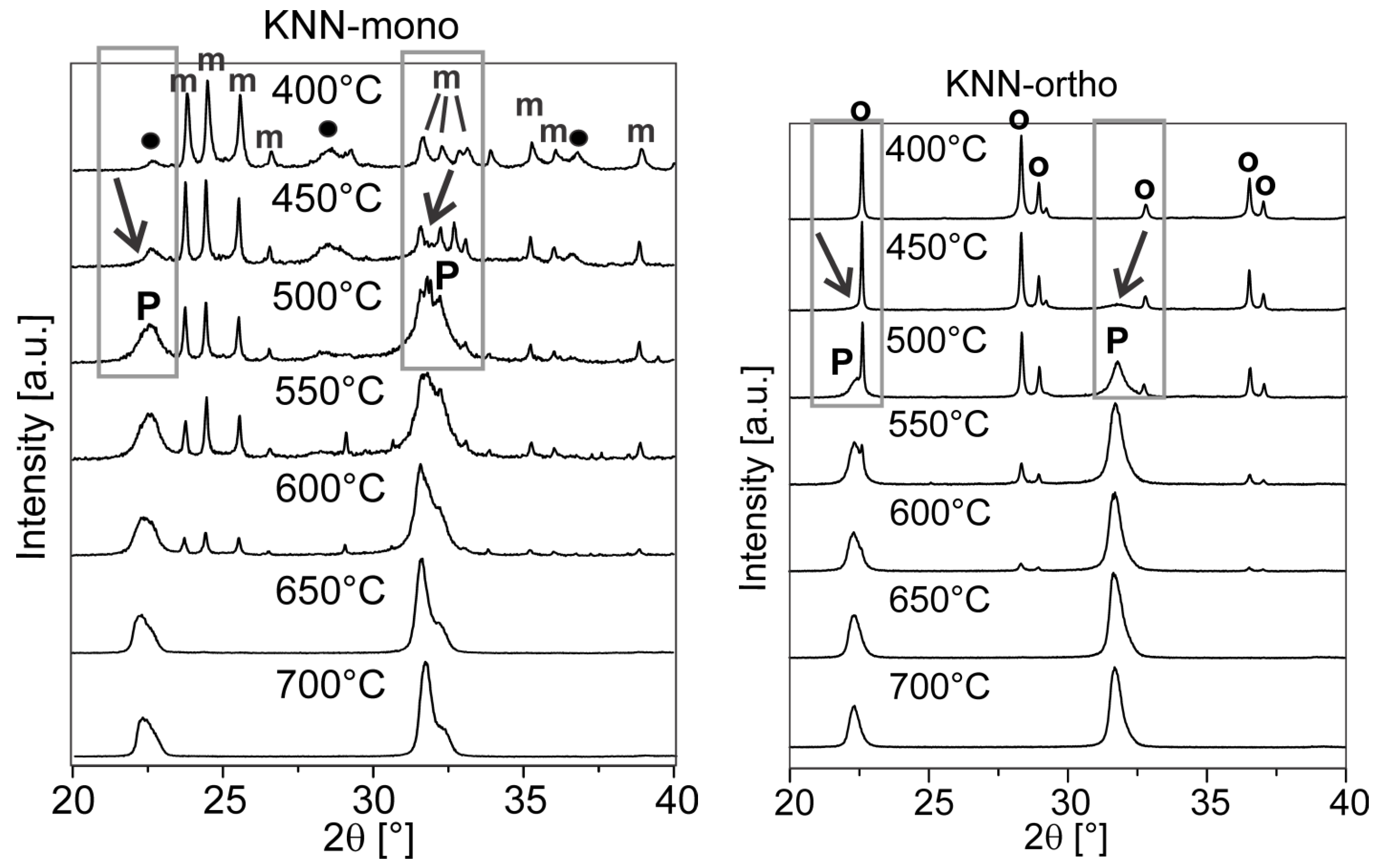 XRD patterns of the homogenized mixtures of KNN prepared from monoclinic and orthorhombic Nb2O5 precursors, denoted as KNN-mono and KNN-ortho, respectively, annealed at 400–700 °C. o stands for orthorhombic Nb2O5; P for the perovskite phase; m for monoclinic Nb2O5; and • for the poorly crystalline orthorhombic phase. The arrows mark the appearing perovskite phase. (Reprinted with permission from [82]. Copyright 2013 Elsevier).