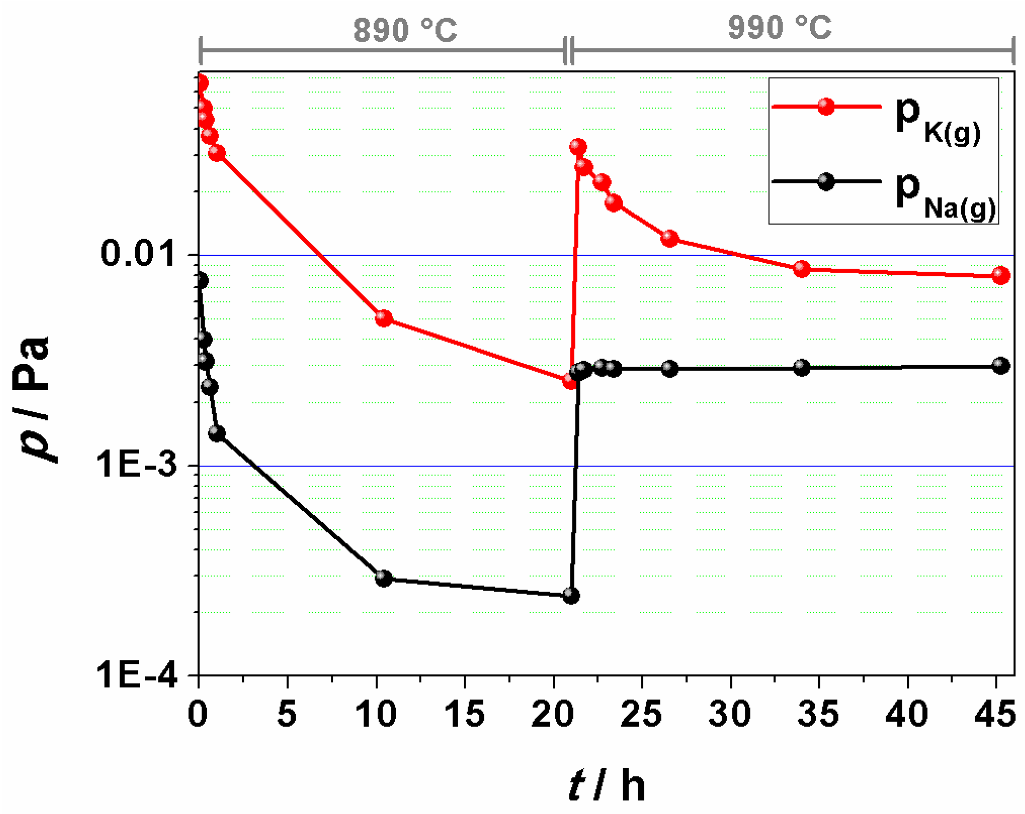 Another problem related to KNN is assumed to be the high vapor pressure of alkalis at high temperatures, which might also result in an alkali deficiency in KNN. However, previous reports yielded contradictory results about which alkali is evaporating and to what extent. A recent Knudsen-effusion mass-spectrometry study revealed that the equilibrium vapor pressure of potassium over KNN is higher than that of sodium, i.e., 8 × 10−3 Pa as compared to 3 × 10−3 Pa at 990 °C [86]. The KNN powder was, prior to the analysis, synthesized by heating a stoichiometric carbonate-oxide mixture at 950 °C for 12 h in an almost closed, platinum crucible in the air. The as-synthesized powder was not in thermodynamic equilibrium, meaning that potassium, and to a lesser extent also sodium, were not completely incorporated into the perovskite structure, as evidenced by the initially high and progressively decreasing vapor pressures of the two alkalis, see Figure 6. The equilibrium could be achieved only by additionally extended heating, for example, in the case of potassium, for 21 h at 890 °C and 23 h at 990 °C.