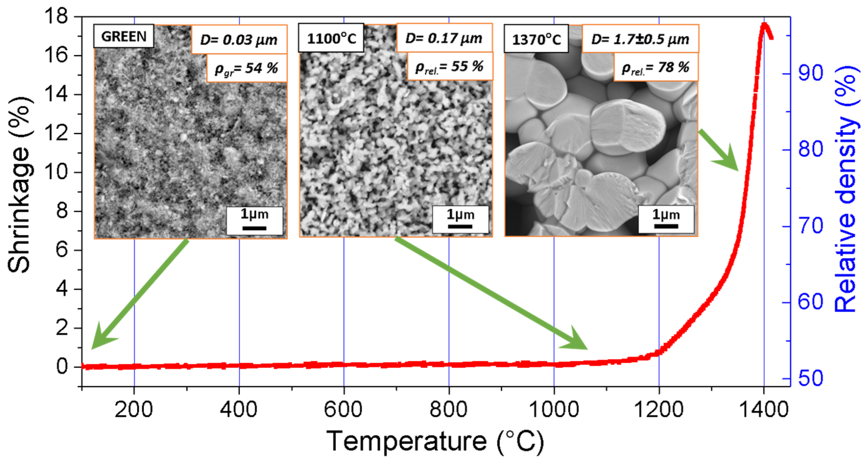 The sintering mechanisms in NaNbO3 were investigated using powders with two different particle sizes: a submicrometer-sized powder with a primary particle size of 100–300 nm (submicron-NaNbO3) was prepared by conventional solid-state synthesis [55], while the nanometer-sized powder with a particle size of about 25–30 nm (nano-NaNbO3) was obtained by top-down processing using a solid-state synthesis and colloidal milling [89]. The sintering behavior of both powders was studied using optical dilatometry and microstructure analysis, and the material-transport mechanisms were investigated [90]. The dynamic sintering curves revealed a very narrow shrinkage interval just below the melting point, as typically observed in alkaline niobates [91,92]. Although the densification of the nano-NaNbO3 started at a 100 °C lower temperature, both samples reached the same relative density at 1280 °C and their densification curves coincided at higher temperatures. The investigation of the microstructure development revealed no densification and considerable coarsening during the initial heating stage between room temperature and 1100 °C, since the grains of the submicron-NaNbO3 and the nano-NaNbO3 grew by 70% and 460%, respectively (Figure 7). Upon further heating both samples started to densify and reached a density of about 75% and a grain size of 1.7 μm at the highest investigated temperature of 1370 °C. Note that low-temperature coarsening was also previously reported for NaNbO3 powders prepared by other synthesis routes [93]. The competing effects of densification and grain growth during the heating of NaNbO3 are summarized in Figure 8 in the form of microstructure-development trajectories. The comparison reveals that regardless of the initial powder particle size, both NaNbO3 samples exhibit similar sintering behavior with considerable grain growth during the initial sintering stage, before the activation of the main densification process. It should be noted that this behavior is very different to that of other ceramic systems with comparable particle sizes, for which the trajectories are typically exponential functions with rapid densification and negligible grain growth during the intermediate sintering stage and considerable grain growth once a critical density is reached [94,95,96].