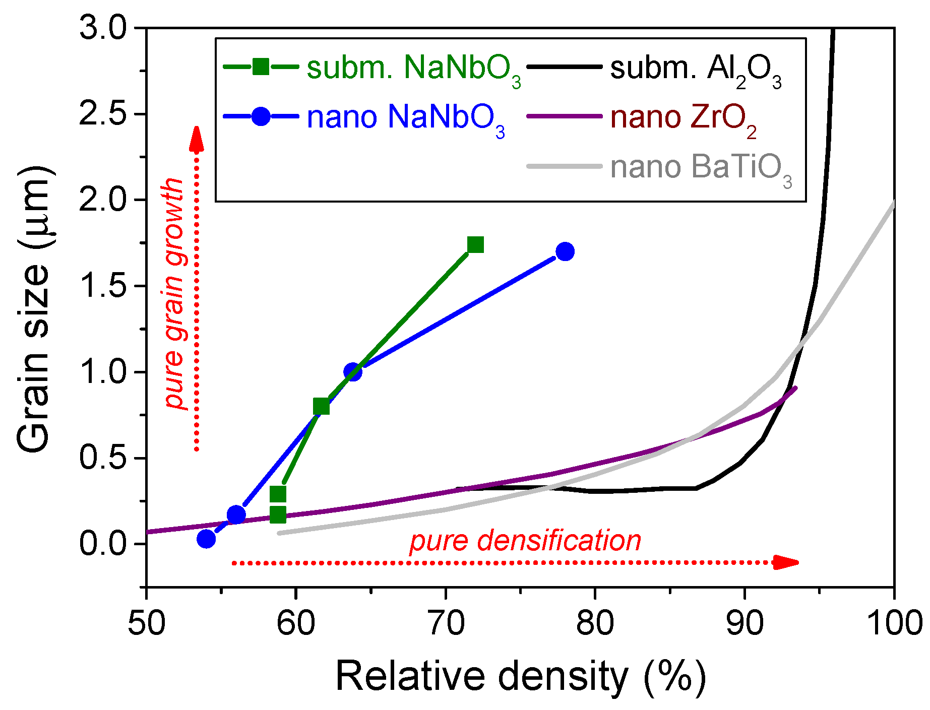 Microstructure-development trajectories for submicron- and nano-sized NaNbO3 [90], submicron-sized Al2O3 [94], nano-sized ZrO2 [95], and nano-sized BaTiO3 [96] powder compacts.
