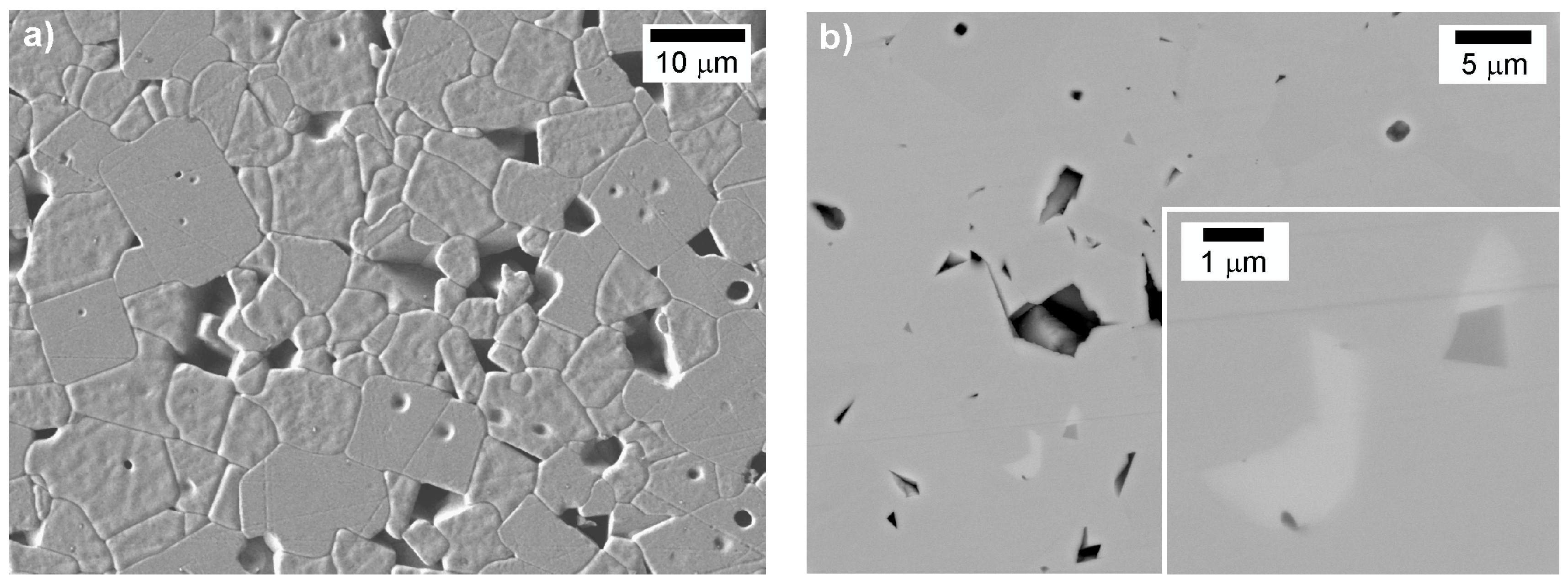 Microstructure of the KNN ceramic sintered at 1120 °C for 2 h, with a relative density of 92.4%, (a) thermally etched surface, (Reprinted with permission from [82]. Copyright 2013 Elsevier), SEM secondary electrons image (SEI), (b) polished surface, SEM backscattered electrons image (BEI), inset showing the white secondary tungsten-bronze type phase.