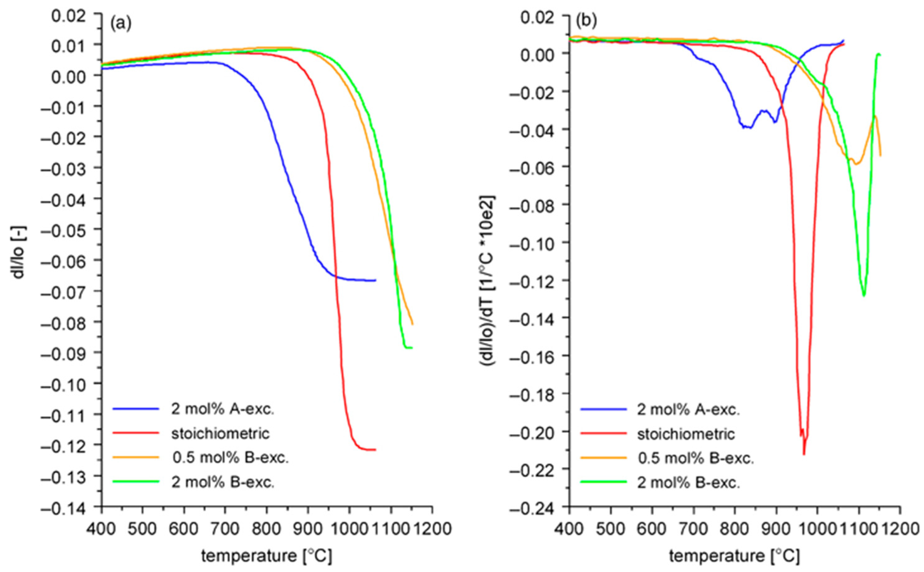 The importance of lattice vacancies for the densification of perovskites was emphasized by Jaffe in his standard textbook [25]. If A-site vacancies are introduced, the diffusion is enhanced, while the oxygen vacancies act as diffusion inhibitors.