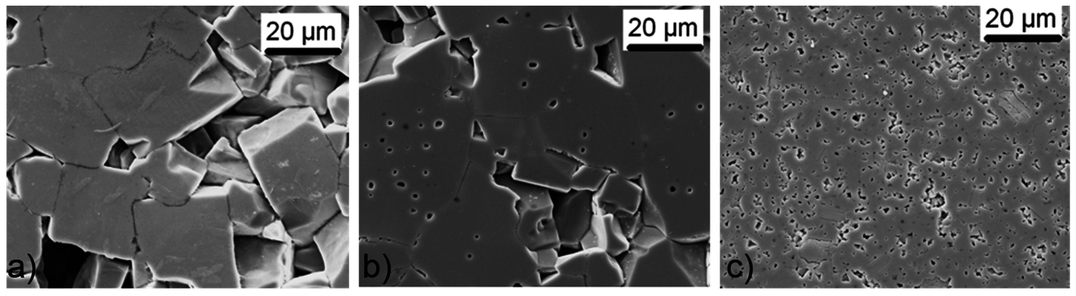 Microstructures of (a) alkali-excess (2%); (b) stoichiometric; and (c) Nb-excess (2%) KNN ceramics, sintered at 1105 °C, 2 h (Reprinted with permission from [33]. Copyright 2010 The American Ceramic Society).