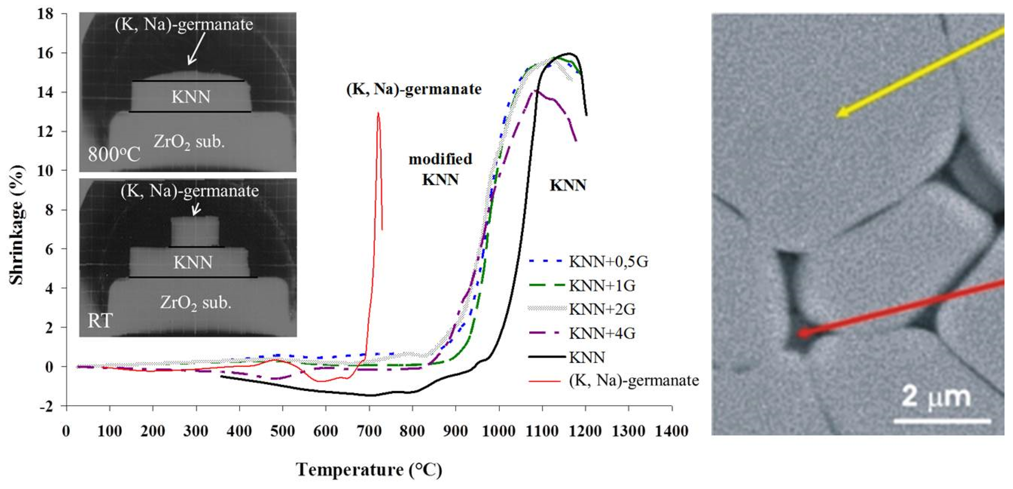 Shrinkage versus temperature of KNN, (K,Na)-germanate and KNN modified with 0.5, 1, 2 and 4 wt % of (K,Na)-germanate (KNN + 0,5G, KNN + 1G, KNN + 2G, KNN + 4G) powder compacts. Photos of the wetting experiments in a heating-stage microscope at room temperature and at 800 °C are given as insets. (Reprinted with permission from [115]. Copyright 2008 The American Ceramic Society.) Right: microstructure of the KNN + 4G sintered at 1000 °C for 8 h (SEM-BEI). The yellow and red arrows mark the KNN grain and the intergranular germanate phase, respectively. Note the good wetting of the matrix grains and the slightly rounded grain boundaries (Reprinted from [116] with the permission of the author).