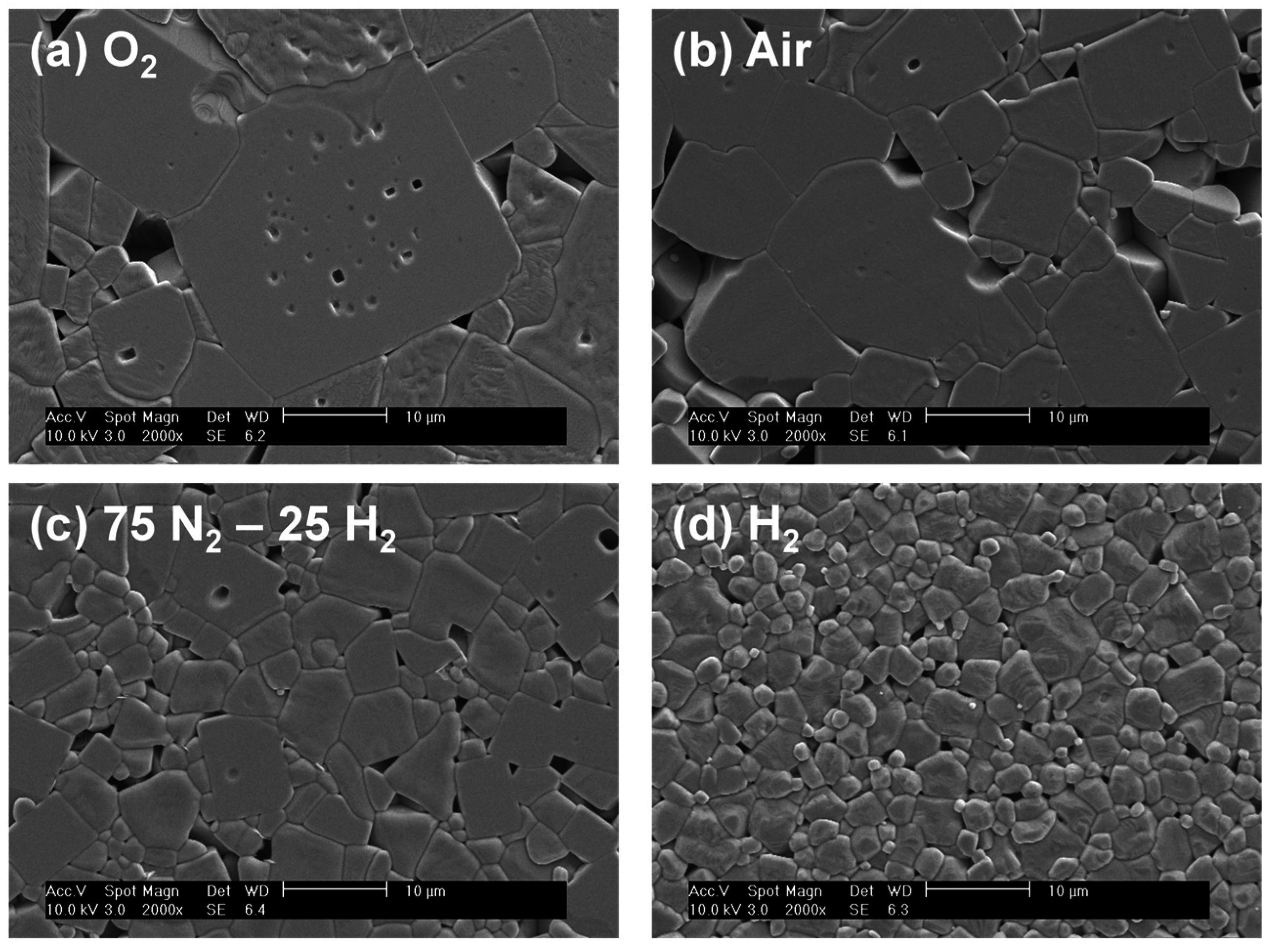 SEM micrographs of K0.5Na0.5NbO3 ceramics sintered at 1100 °C in different atmospheres (Reprinted with permission from [121]. Copyright 2010 Elsevier).