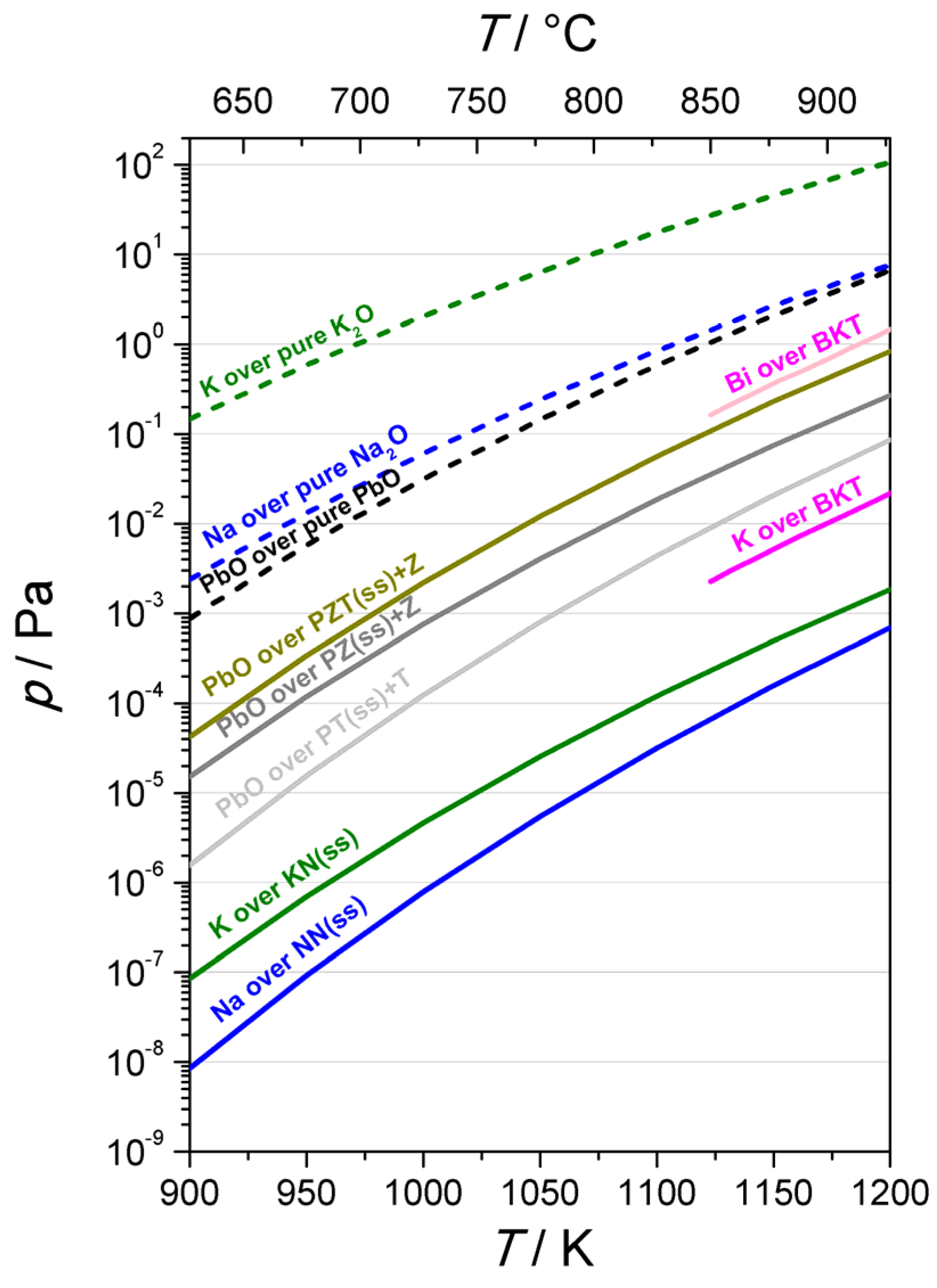 Time-temperature dependence of sodium and potassium vapor pressures over KNN, previously prepared by the calcination of the stoichiometric oxide-carbonate mixture at 950 °C for 12 h. Note that the analysis was performed in vacuum, so the results cannot be directly correlated with heating experiments performed in air, where the evaporation rates of the alkalis are much lower. (Reprinted with permission from [86]. Copyright 2015 The Royal Society of Chemistry).