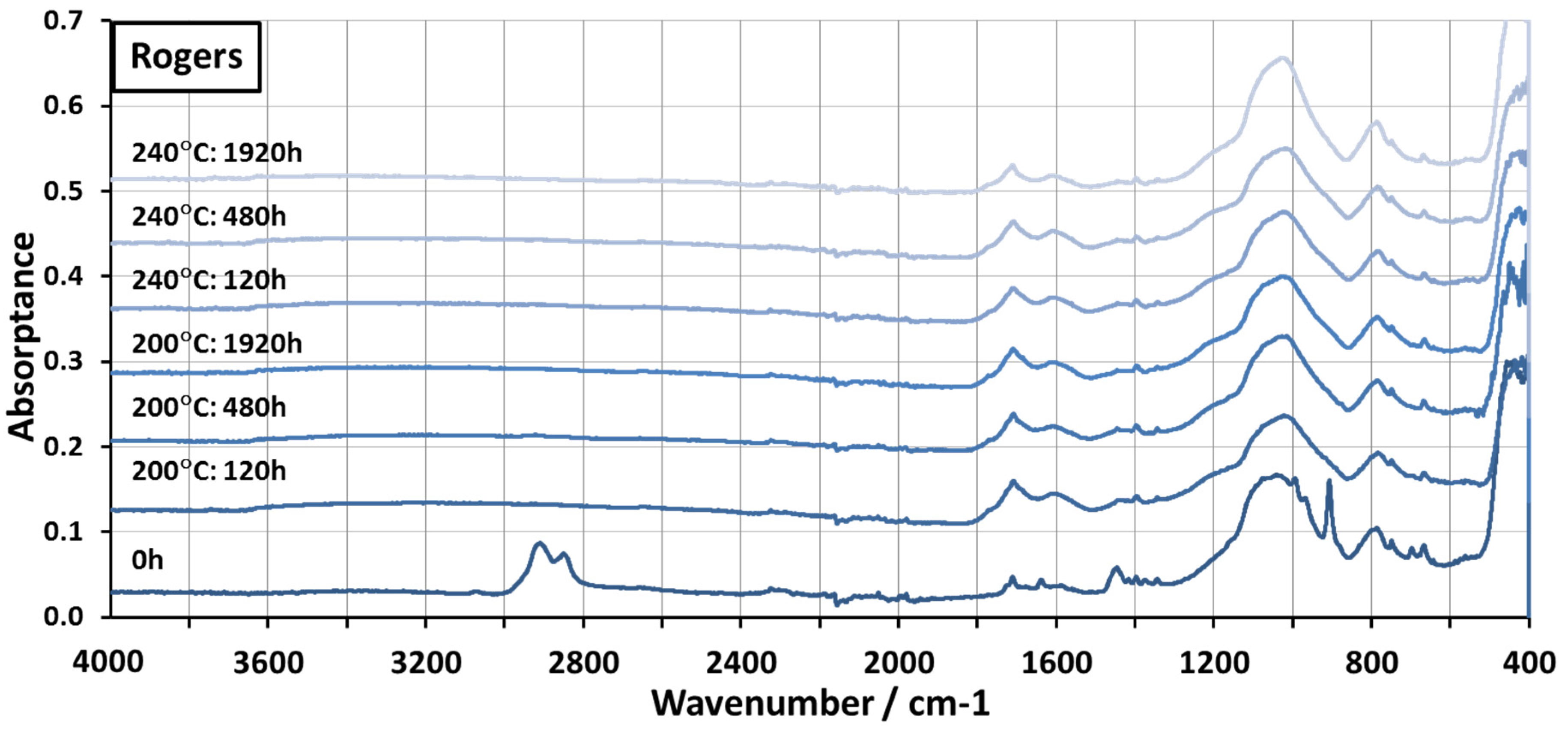 Further thermal analysis was conducted using differential scanning calorimetry (DSC) for the materials before and after aging. For this analysis, the materials were aged in a laboratory oven at 200 °C and 240 °C for 120 h, 480 h, and 1920 h. Mettler Toledo (Greifensee, Switzerland) DSC 1 STARe system was used for the DSC measurements. The measurements were conducted between 40 °C and 300 °C in nitrogen atmosphere with a temperature change rate of 10 K/min. The size of the samples varied between 13 mg and 14 mg for Rogers samples and between 14 and 17 mg for FR-4, except for the sample aged at 240 °C for 1920 h, which had a weight of 11 mg. The same materials were also studied using Fourier transform infrared spectroscopy (FTIR). The FTIR spectra were measured using a Thermo Fisher Scientific (Waltham, MA, USA) Nicolet iS10 FTIR with diamond Attenuated Total Reflectance (ATR) system.