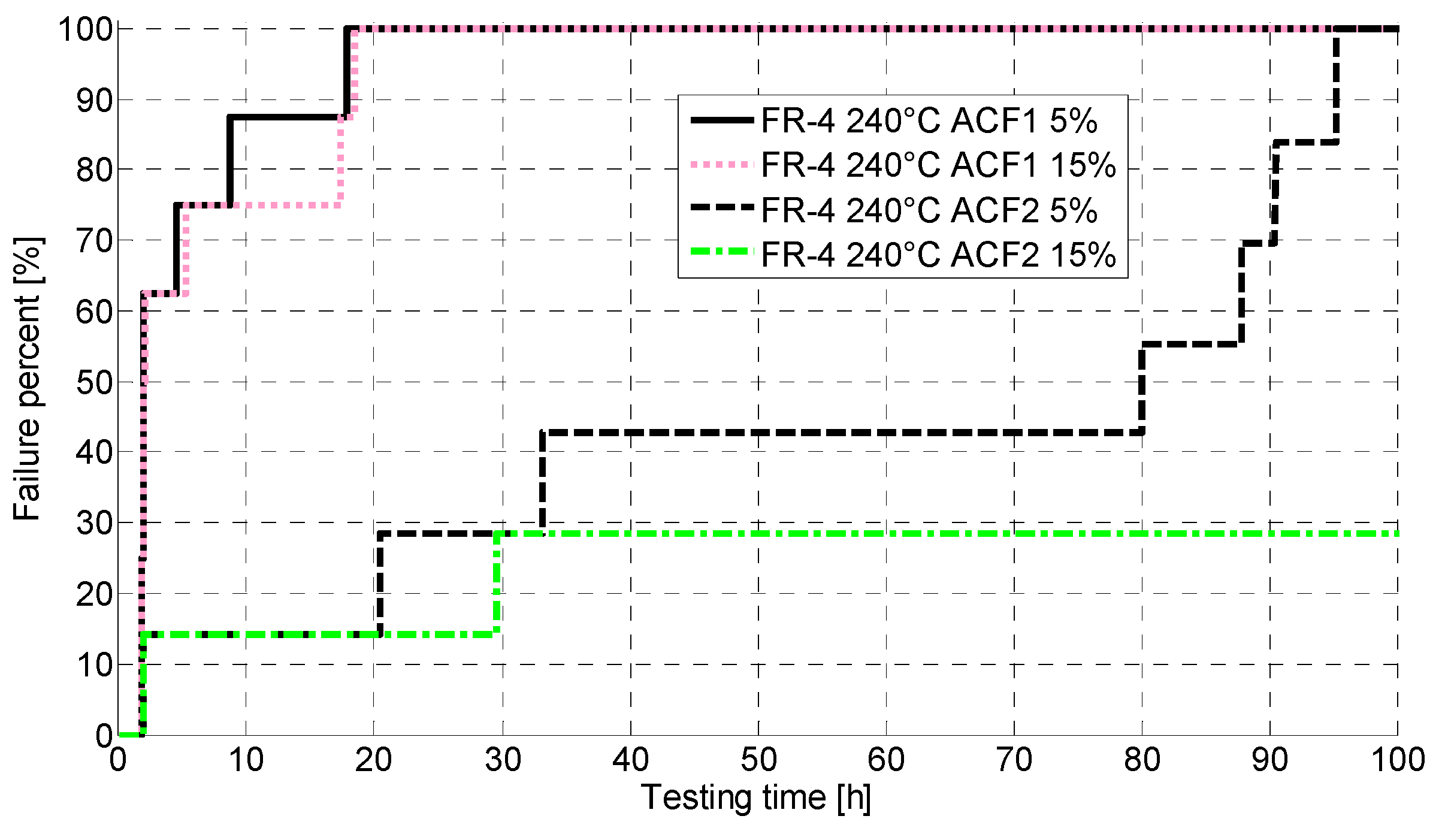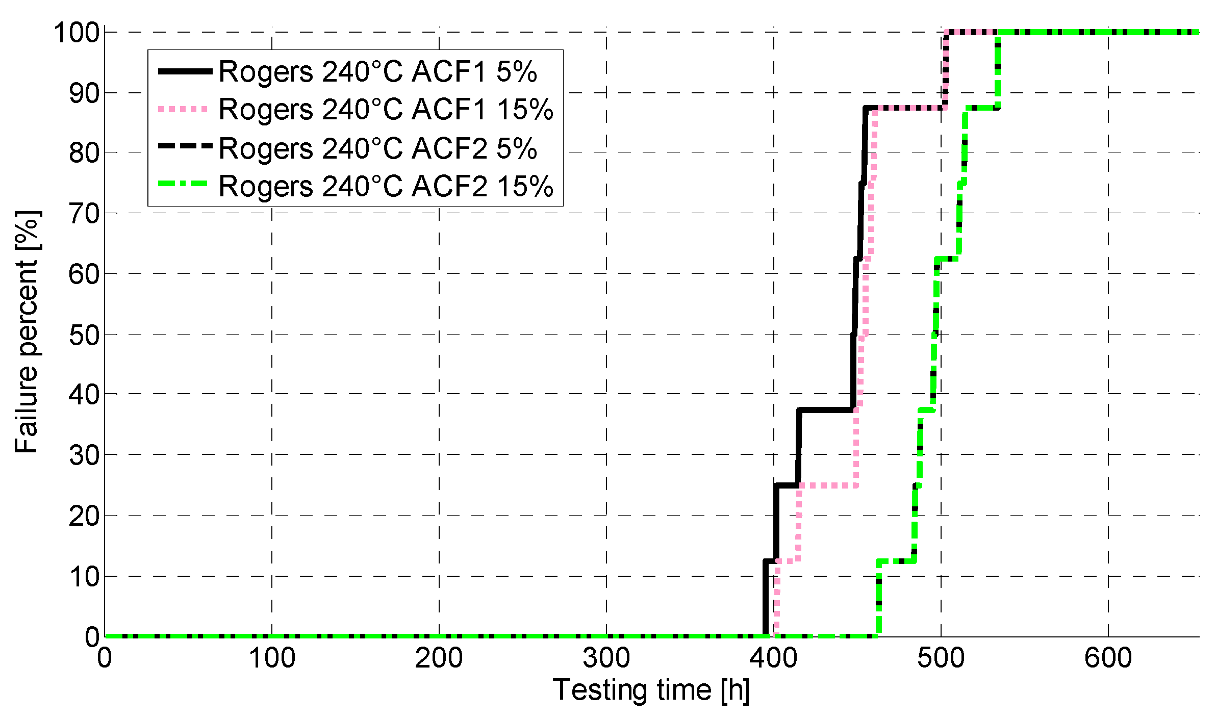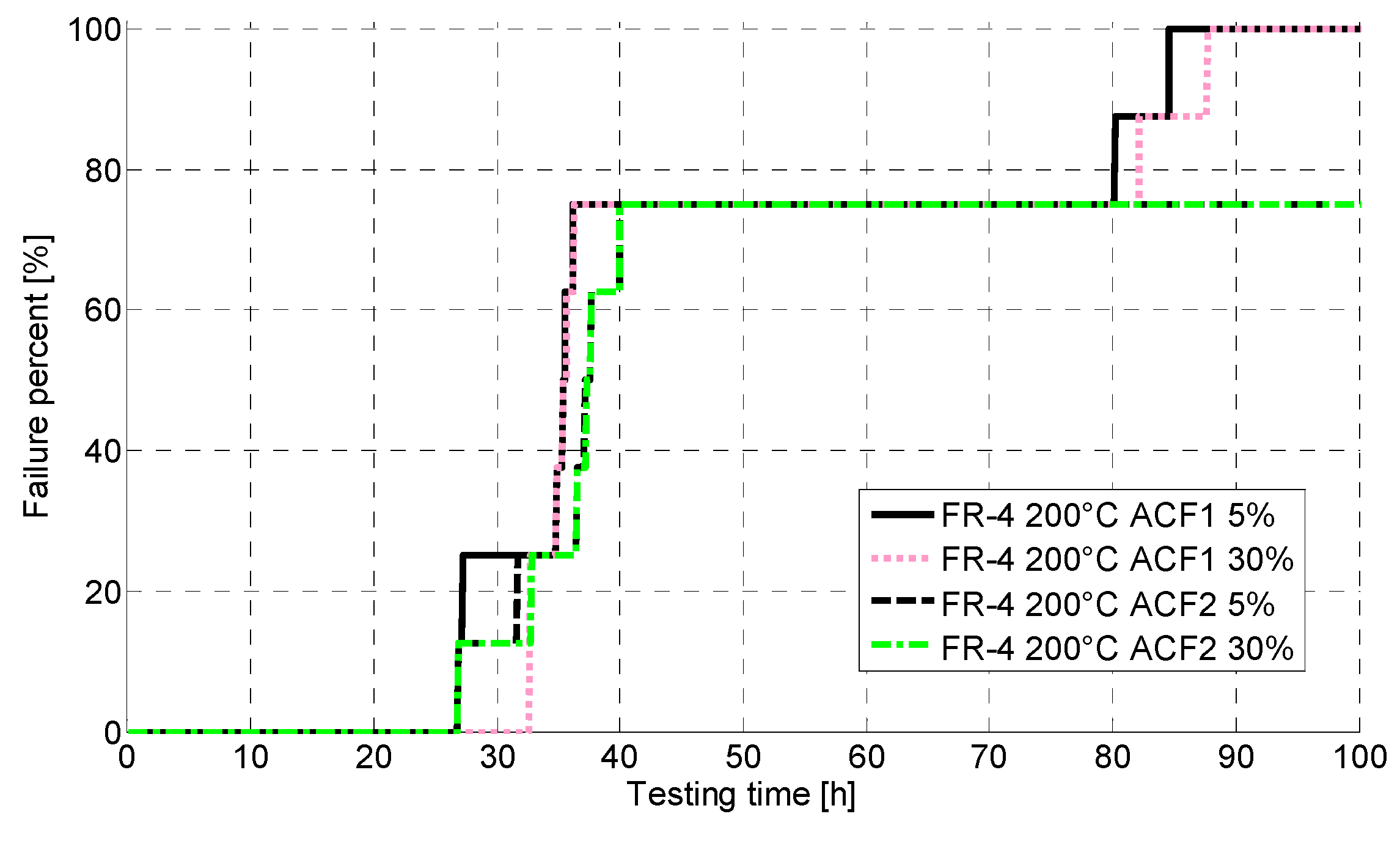 The behavior of the ACF interconnections and the substrates at high temperatures was studied by two thermal storage tests at constant temperatures of 200 °C and 240 °C. During testing the temperature was raised from ambient to testing temperature in two hours, after which the testing was continued at a constant temperature. Testing was conducted in a Binder M240 thermal chamber. It was not possible to remove individual samples from the thermal chamber after they had failed. Therefore, all the samples were tested for the same period of time regardless of their failures. Duration of testing at 200 °C was 3000 h for both substrates, and 654 h and 1000 h at 240 °C for Rogers and FR-4 PCBs respectively. The number of test samples for each test lot in all tests was 7–8 attachments with each ACF. The contact resistances of the samples were measured in real-time during testing (