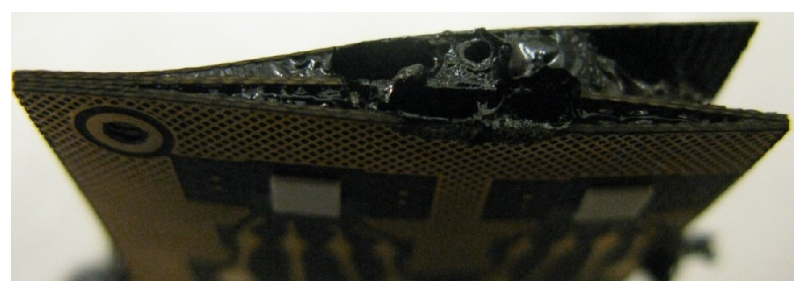 The thermo-oxidative resistance and decomposition of the PCB materials was studied for thermal stability and degradation behavior with simultaneous thermal analysis (STA), a combination of thermogravimetric (TGA) and differential thermal analysis (DTA). The 10–15 mg specimens of cured adhesives were heated from 30 °C to 950 °C at a rate of 10 °C/min under artificial air flow of 20 mL/min with a Perkin Elmer (Waltham, MA, USA) STA 6000, mimicking the degradation conditions in air.