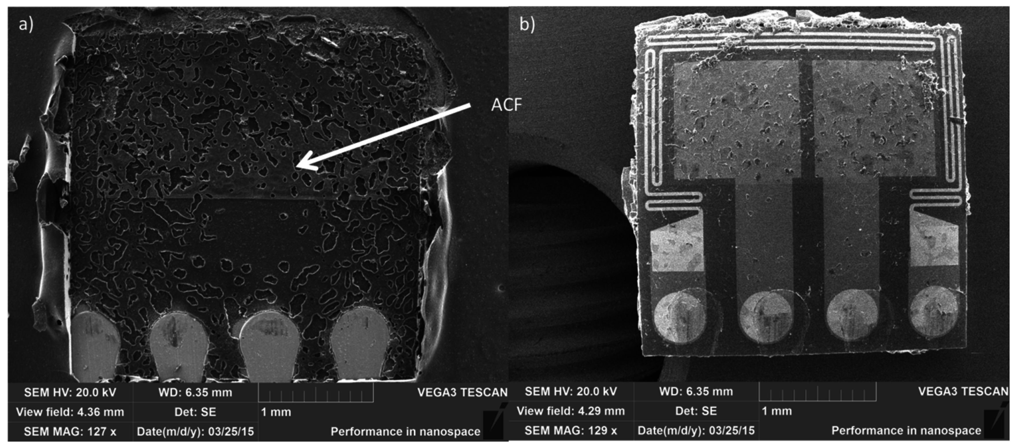 Sensor chips were attached onto the substrates using flip chip technique. The ACAs were attached with a Toray FC-1000 flip chip bonder. The ACFs were first cut to size and placed on the substrate pads. Then, the adhesive was pre-bonded with flip chip bonder using moderate heat and light pressure for a short period of time. The final bonding was done according to the bonding parameters recommended by the ECA manufacturers, using a bonding temperature of 210 °C for 20 s with pressure of 100 MPa.