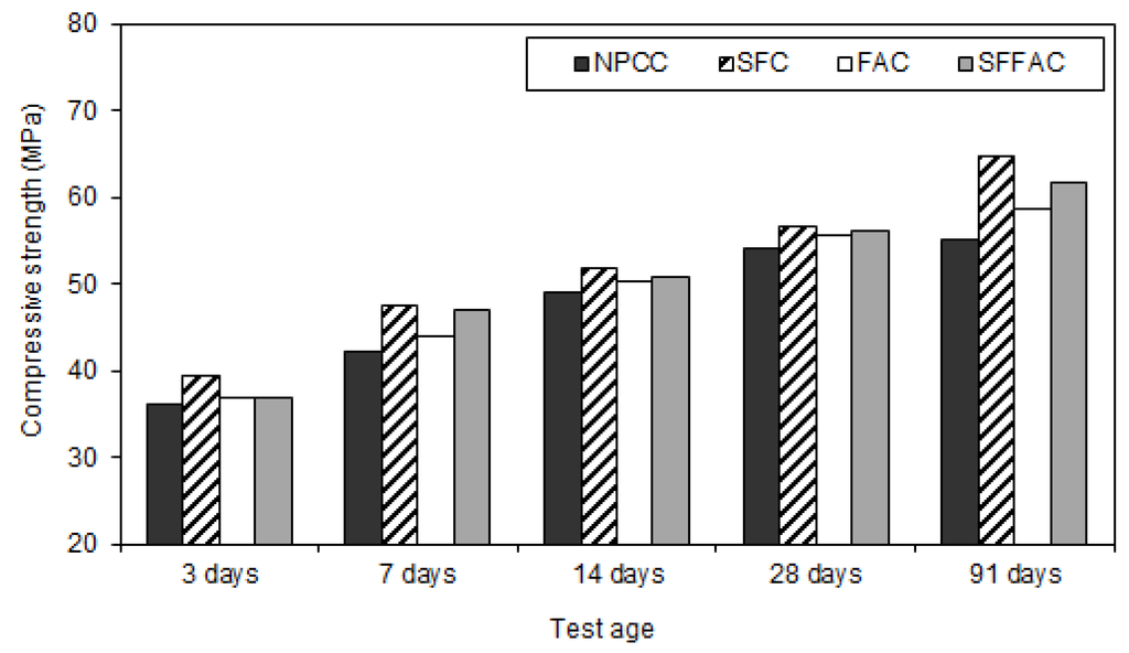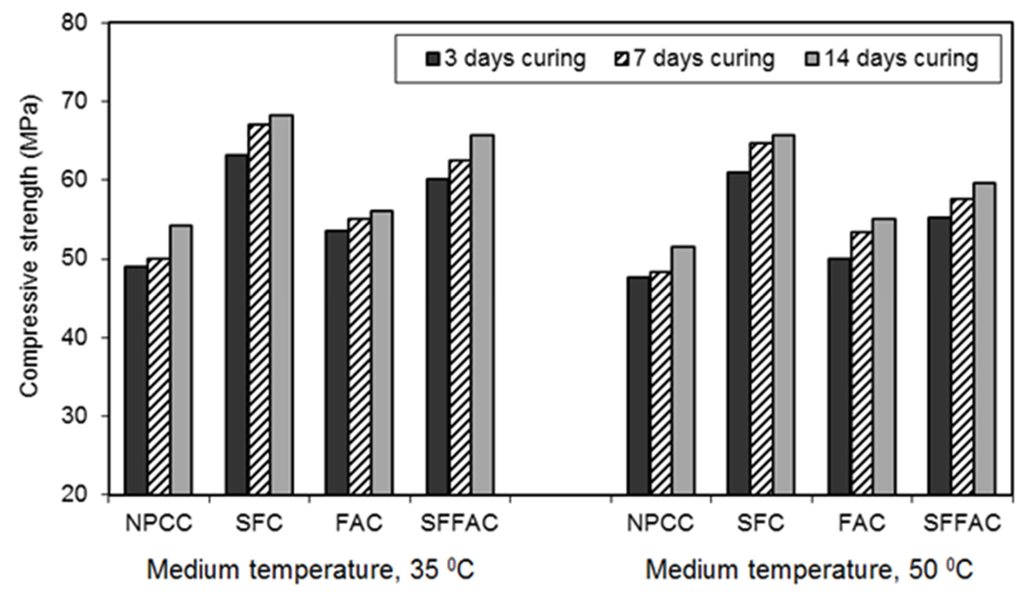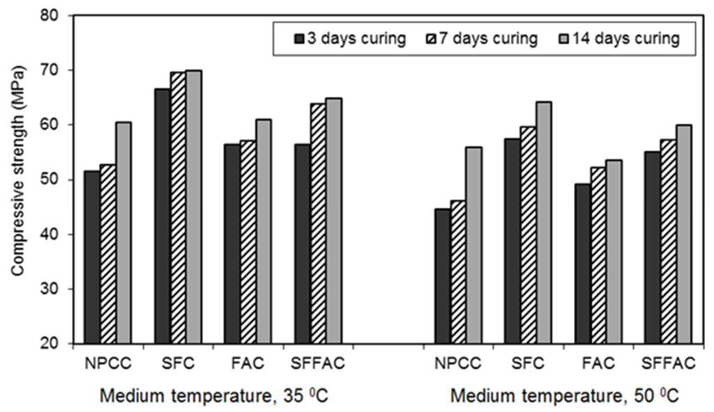 All types of concrete containing SCM showed higher strength achievement than NPCC (control concrete). However, the strength achievement was the highest in the case of SFC. Test results show that after 91 days and at the temperature of 35 °C, SFC produced a compressive strength of 70 MPa. Silica fume is a highly reactive SCM. It readily reacts with water to produce additional hydration products (pozzolanic reaction products). The open channels in SFC are blocked by the high pozzolanic reaction products of silica fume. Besides, silica fume has the micro-filling ability because of its extremely small particle size, as discussed earlier in Section 4.2.1 and Section 4.2.2. Hence, it fills in the microvoids between cement particles. Moreover, an enhanced bonding strength develops between cement paste and aggregate because of the accelerated pozzolanic and micro-filling actions of silica fume. These are the probable reasons why SFC exhibited the highest gain in compressive strength as compared with other concretes.
