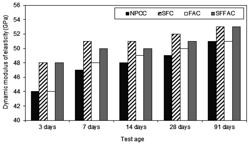 All SCM concretes produced a higher dynamic modulus of elasticity than NPCC at all ages and temperatures (refer to Figure 5, Figure 6 and Figure 7). The increase in dynamic modulus of elasticity in the SCM concretes is related to the efficiency of SCM. The efficiency of SCM results from the role it plays as a micro-filler and porosity reducer [18,44]. Besides, the efficiency depends upon water availability during hydration, curing period, and exposure to temperature. The results of ISA and moisture movement tests indicate that SFC had the lowest porosity and most refined pore structure (refer to Section 4.2.1 and Section 4.2.2). This means that silica fume was most efficient in reducing the loss of moisture from concrete, and therefore SFC provided the highest level of dynamic modulus of elasticity. Indeed, this is due to the role played by silica fume as an effective micro-filler and porosity reducer at the early ages of concrete. Moreover, the presence of silica fume in SFFAC acted more crucially than fly ash to increase the dynamic modulus of elasticity. This also reveals the essential role of silica fume in producing HPC.
