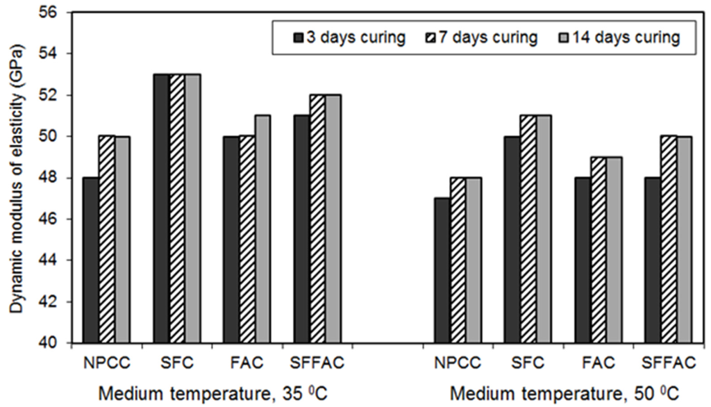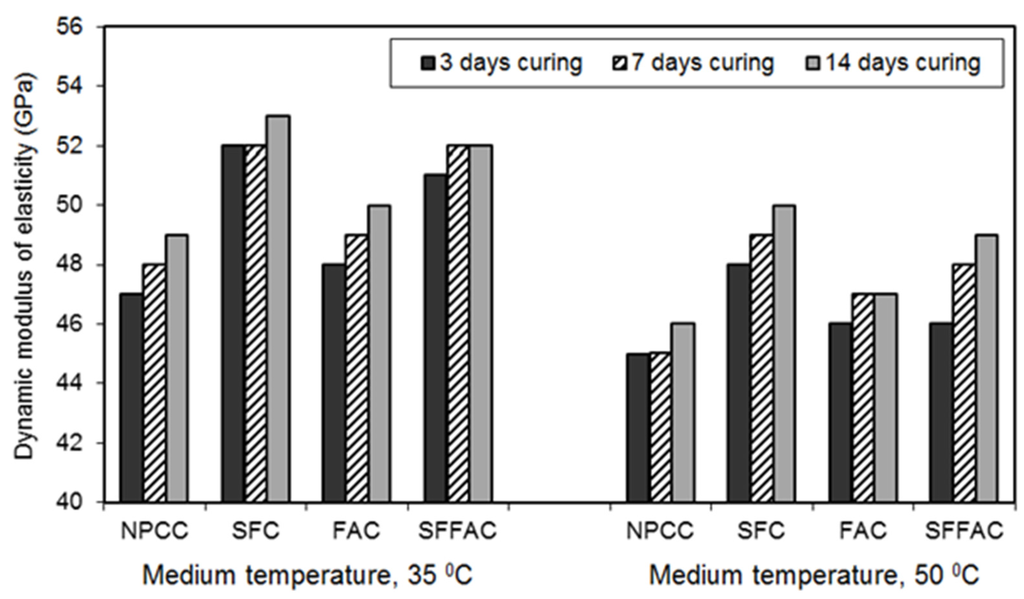 - The compressive strength and dynamic modulus of elasticity of the concretes dried at 35 °C were higher than those of the concretes dried at 50 °C. This indicates that the compressive strength and dynamic modulus of elasticity of concrete decreased as the temperature increased. However, the effect of temperature rise was less detrimental in SCM concretes than NPCC.