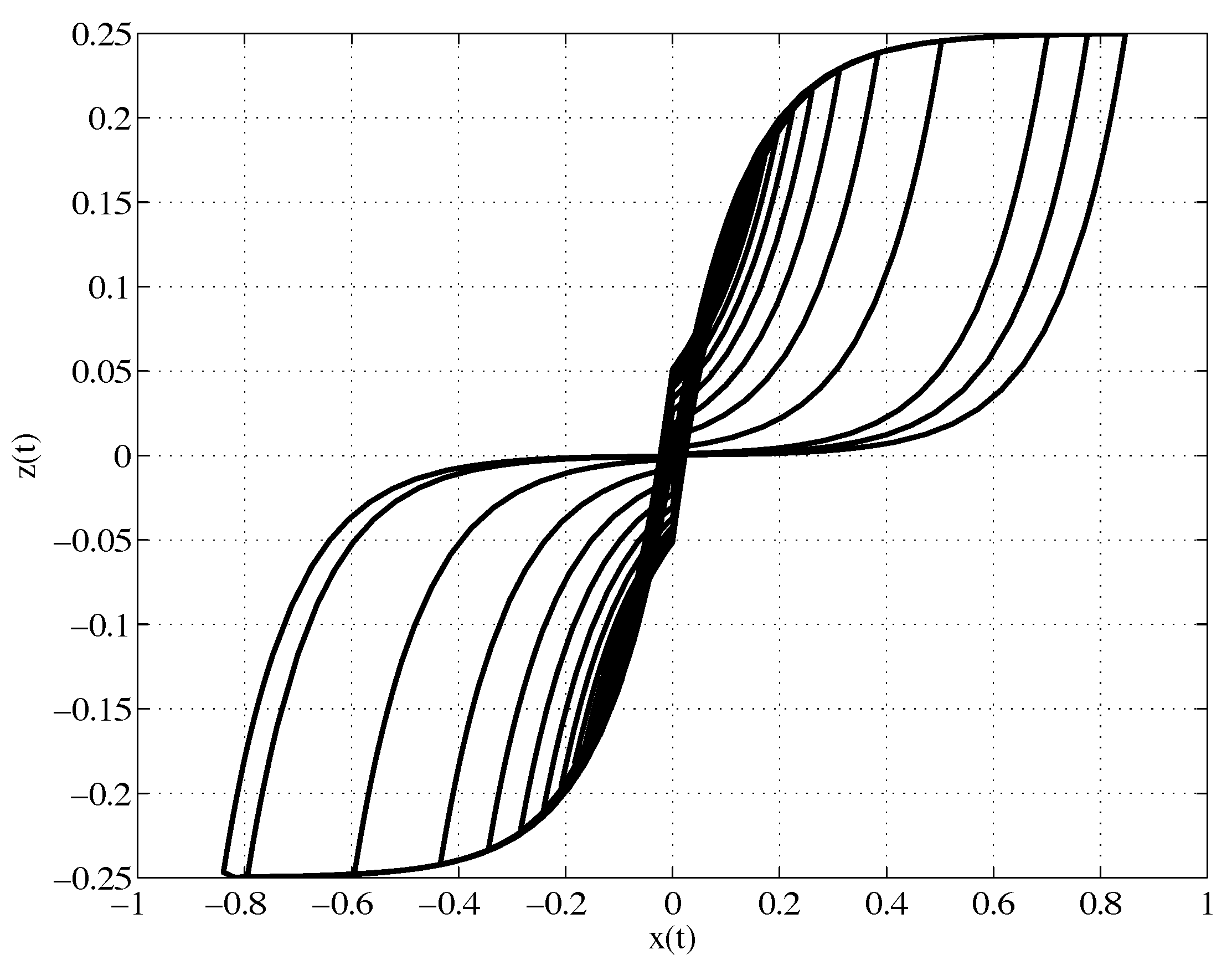 In this section, the Class I double-loop Bouc–Wen model in Equations (1)–(4) is shown to be passive. The relationship between Lyapunov stability and passivity is very close [22]. This connection can be determined by using a storage function as a Lyapunov function. More precisely, passivity is the property describing that any storage energy in a system is less than or equal to the energy supplied to this system from external sources. Therefore, the connection between passivity and Lyapunov stability increases the interest in passivity. However, passivity is not only linked to Lyapunov stability, since there are also some elements that connects optimality and passivity [23]. Finally, passivity can also be considered as a particular case of dissipativity [24]. Passivity has been considered in recent years in many different areas: in electrical networks, for instance, passitivy implies that the network consists of passive elements so that the network does not produce energy. In mechanics, passivity is also associated to energy dissipation.