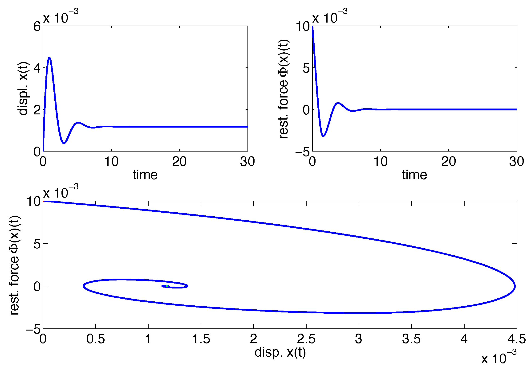 Let us assume that is a Class I model so that , , , and . Initial conditions are set to , and . The upper left plot in Figure 2 shows the displacement of the system described in Equation (5) versus the time, the upper right plot shows the restoring force versus the time and, finally, the lower plot shows the two-dimensional implicit plot of the restoring force versus the displacement. Since niether of the upper plots show a periodic steady-state, no limit cycle is observed in the lower plot and, therefore, the particular Class I system in Equation (5) is said to be passive.