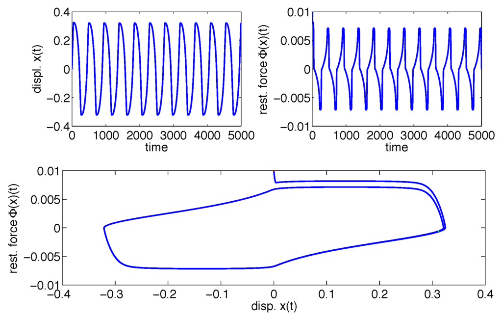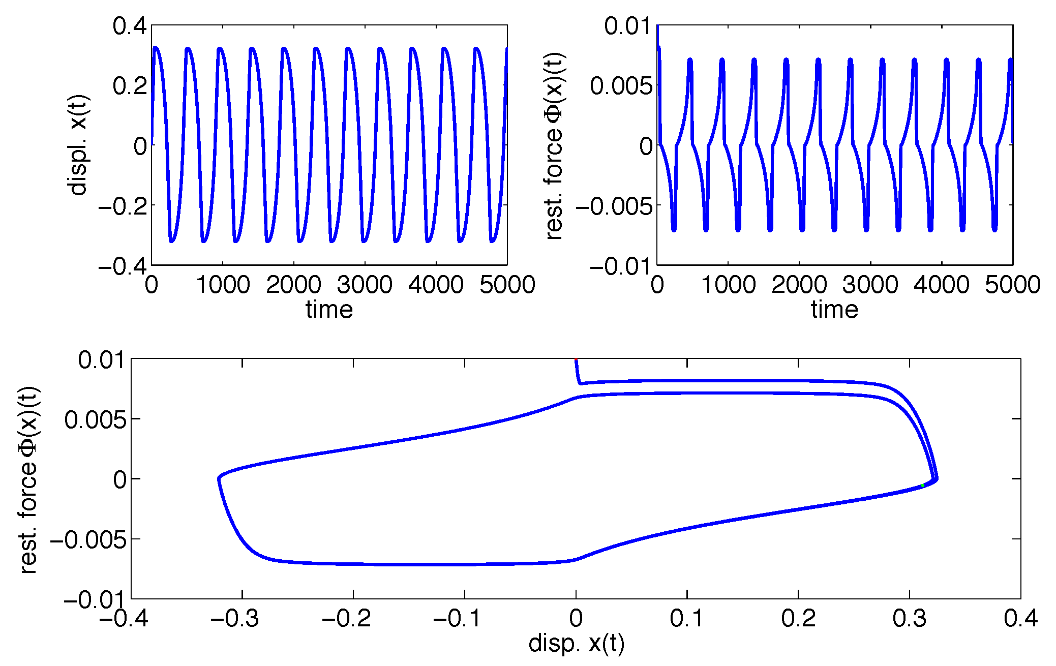 Contrarily, consider now that belongs to Class IV. Thus, for instance, , , , and . The upper left plot in Figure 3 shows the displacement of the system described in Equation (5) versus the time, the upper right plot shows the restoring force versus the time and, finally, the lower plot shows the two-dimensional implicit plot of the restoring force versus the displacement. In this case, however, both upper plots show a periodic steady-state, and a limit cycle is observed in the lower plot. Therefore, the Class IV model is not physically consistent, as stated.