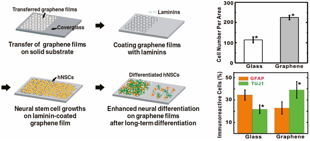 The enhancement of growth and differentiation of human neural stem cells (hNSCs) on graphene-coated cover glass. β3 Tubulin (Tuj1) and glial fibrillary acidic protein (GFAP) are the representative markers of neurons and glial cells, respectively. Reprinted with permission from [45]. Copyright 2011 John Wiley and Sons.