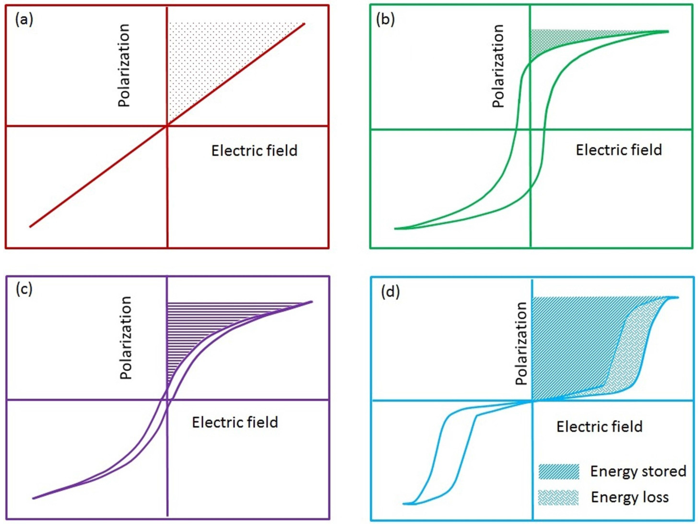 Figure represents the typical polarization versus electric field (P-E) hysteresis loops and energy storage characteristics of the four classes of solid dielectric materials namely (a) linear; (b) ferroelectric; (c) relaxor ferroelectric; (d) anti-ferroelectric (demonstration only; not to scale).