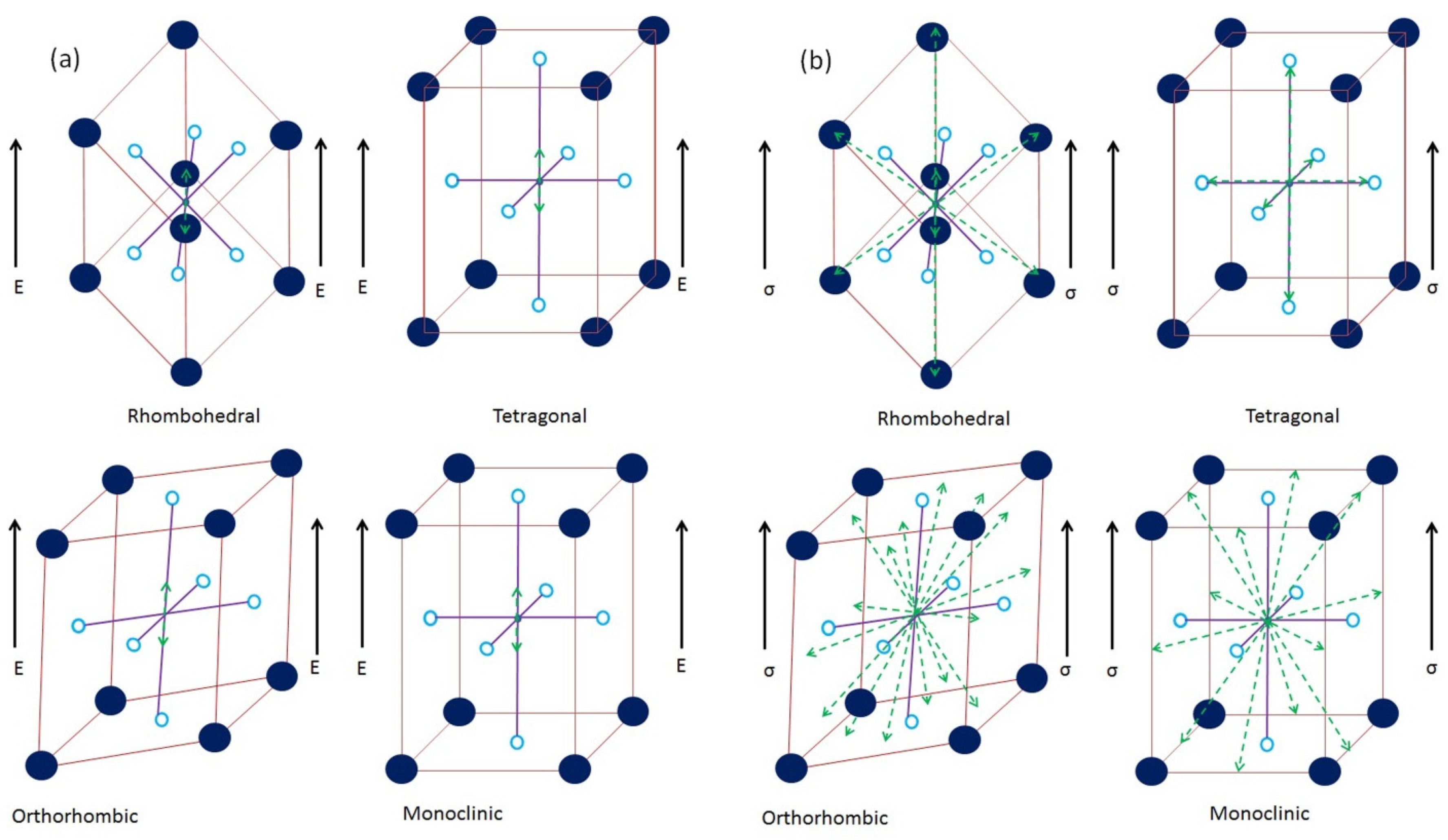 Graphical representation of the mechanism and various switching directions associated with different crystallographic structures under (a) ferroelectric; (b) ferroelastic domain rotation, respectively.
