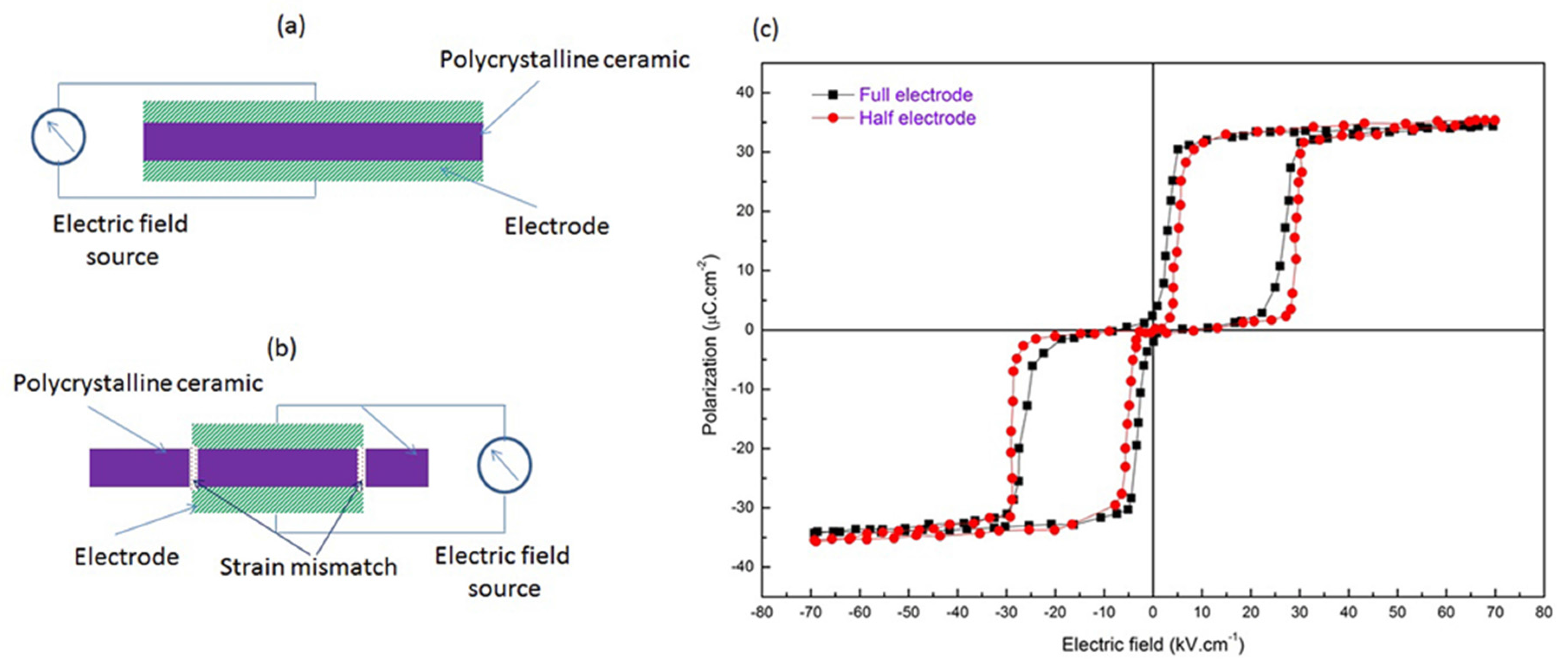 Graphical representation of anti-ferroelectric ceramics’ cross-sectional view of (a) completely electroded ceramic; (b) half electroded ceramic (green is electrode (hatched), purple is ceramic); and (c) P-E hysteresis loops for of Pb0.99Nb0.02[(Zr0.57Sn0.43)1−yTiy]0.98O3 material under induced self-confinement. Data adapted from [47].