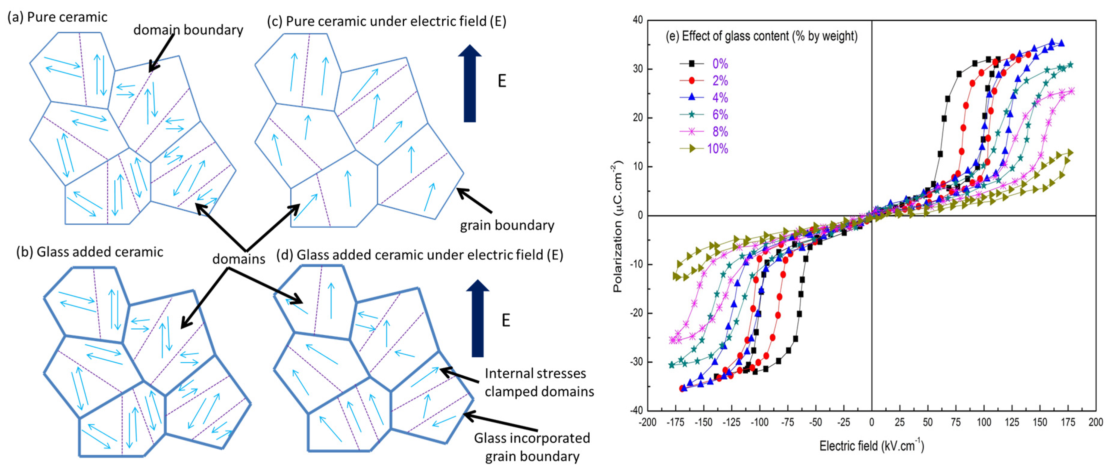 The effect of internal clamping at a microscopic level due to glass incorporation, in anti-ferroelectric material for (a) pure ceramic; (b) ceramic with glass incorporation; (c) pure ceramic under electric field; and (d) glass-ceramic composite under electric field and their domain behavior; (e) P-E hysteresis loops for Pb0.97La0.02(Zr0.56Sn0.35Ti0.09)O3 glass ceramic composite [60].