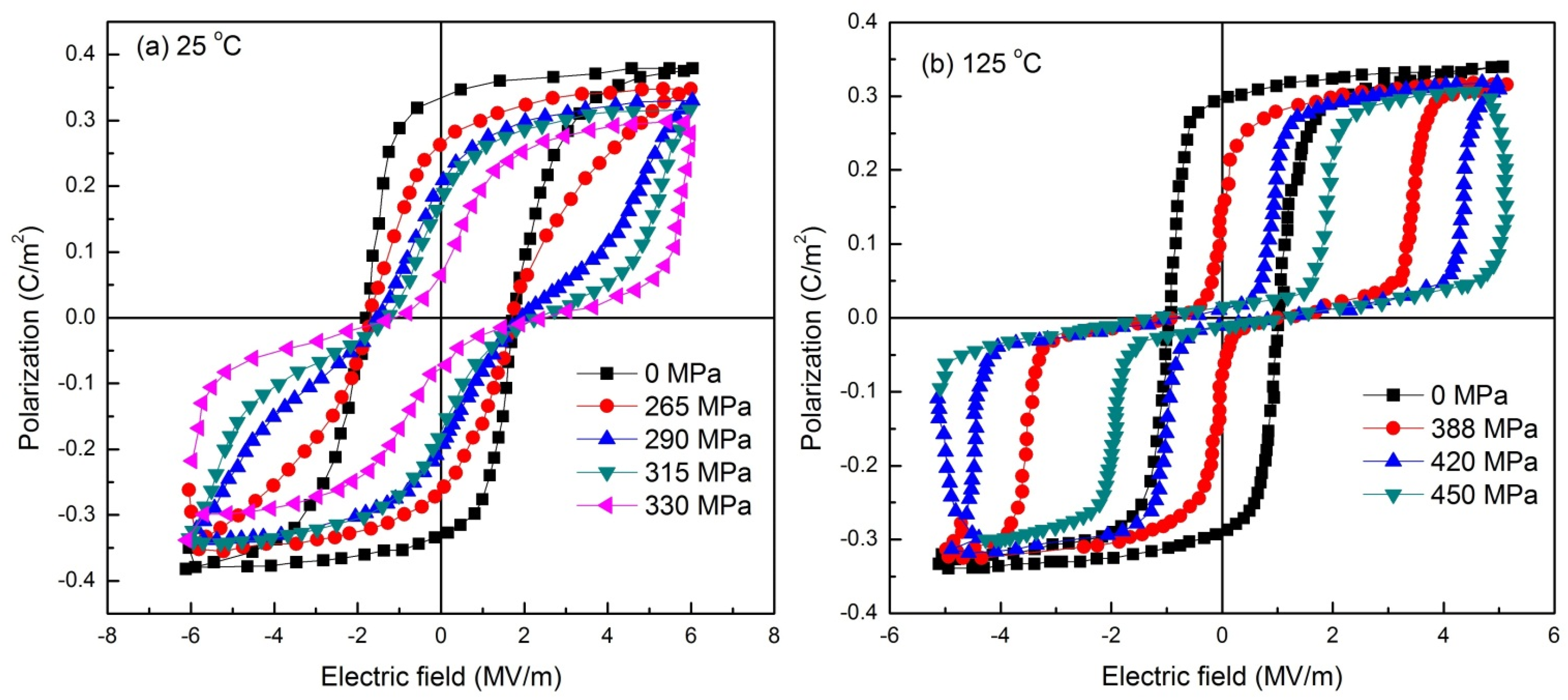 P-E hysteresis loops of the Nb modified 95/5 PbZrTiO3 bulk ceramics, obtained as a function of hydrostatic pressure at the temperatures of (a) 25 °C; (b) 125 °C. Data adapted from [108].